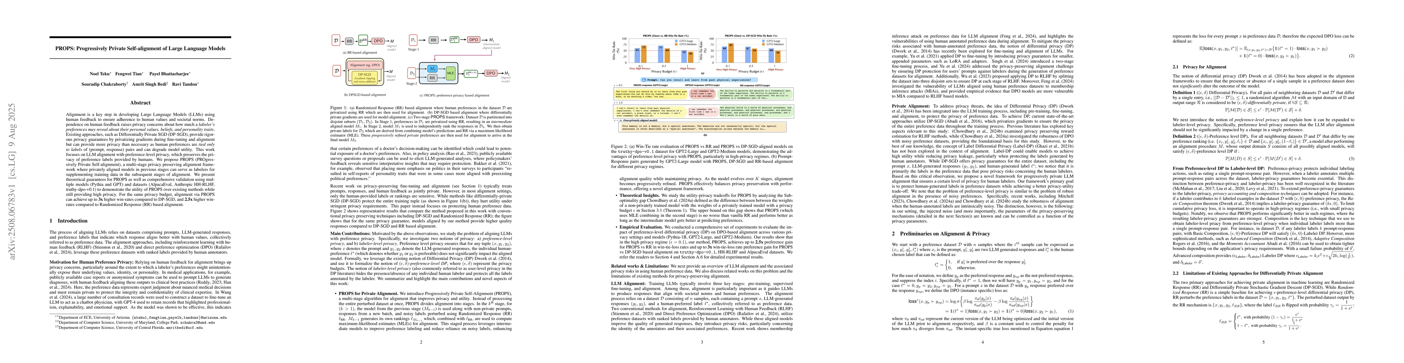 The research introduces PROPS, a privacy-preserving framework for aligning Large Language Models with human values. PROPS progressively refines model alignment using privately aligned models from previous stages to label additional training data, offering higher utility and win-rates compared to existing methods like DP-SGD and Randomized Response, while maintaining preference-level privacy.