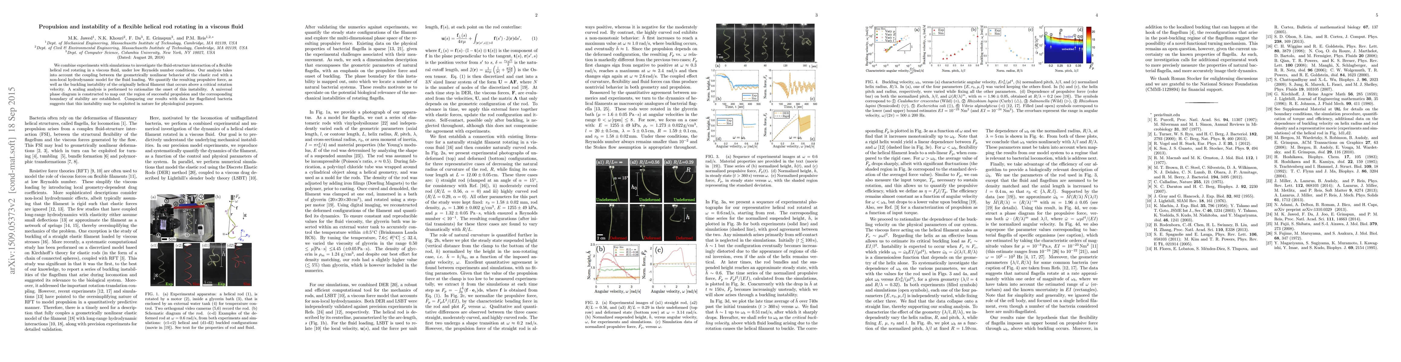 This study combines experiments and simulations to analyze the fluid-structure interaction of a flexible helical rod rotating in a viscous fluid, revealing the coupling between the rod's nonlinear elasticity and hydrodynamic forces. It identifies a critical rotation velocity above which the rod undergoes buckling instability, providing a universal phase diagram for propulsion and stability.