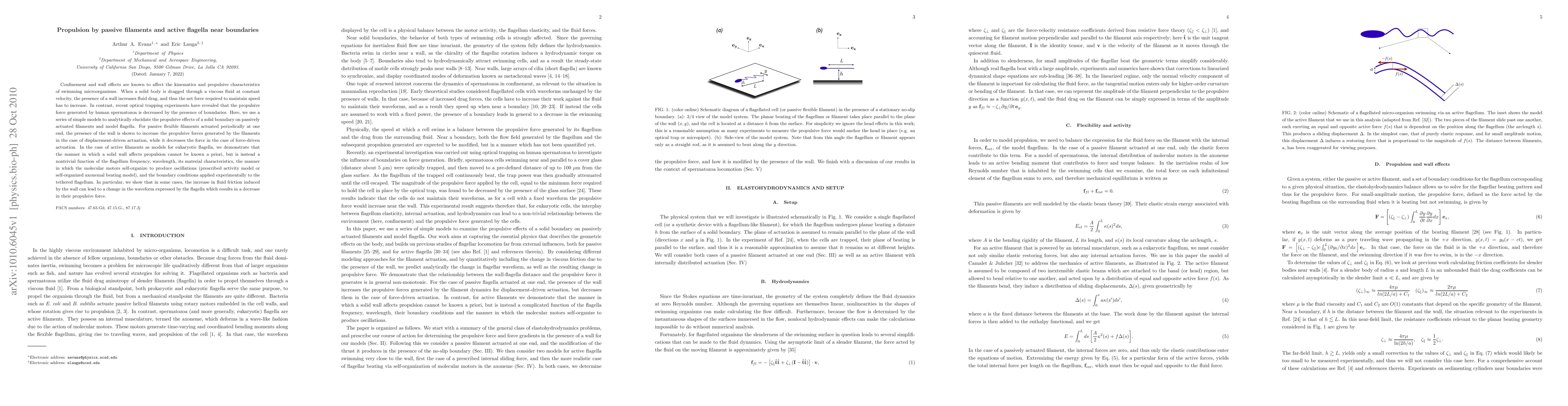 Confinement and wall effects are known to affect the kinematics and propulsive characteristics of swimming microorganisms. When a solid body is dragged through a viscous fluid at constant velocity, the presence of a wall increases fluid drag, and thus the net force required to maintain speed has to increase. In contrast, recent optical trapping experiments have revealed that the propulsive force generated by human spermatozoa is decreased by the presence of boundaries. Here, we use a series of simple models to analytically elucidate the propulsive effects of a solid boundary on passively actuated filaments and model flagella. For passive flexible filaments actuated periodically at one end, the presence of the wall is shown to increase the propulsive forces generated by the filaments in the case of displacement-driven actuation, while it decreases the force in the case of force-driven actuation. In the case of active filaments as models for eukaryotic flagella, we demonstrate that the manner in which a solid wall affects propulsion cannot be known a priori, but is instead a nontrivial function of the flagellum frequency, wavelength, its material characteristics, the manner in which the molecular motors self-organize to produce oscillations (prescribed activity model or self-organized axonemal beating model), and the boundary conditions applied experimentally to the tethered flagellum. In particular, we show that in some cases, the increase in fluid friction induced by the wall can lead to a change in the waveform expressed by the flagella which results in a decrease in their propulsive force.