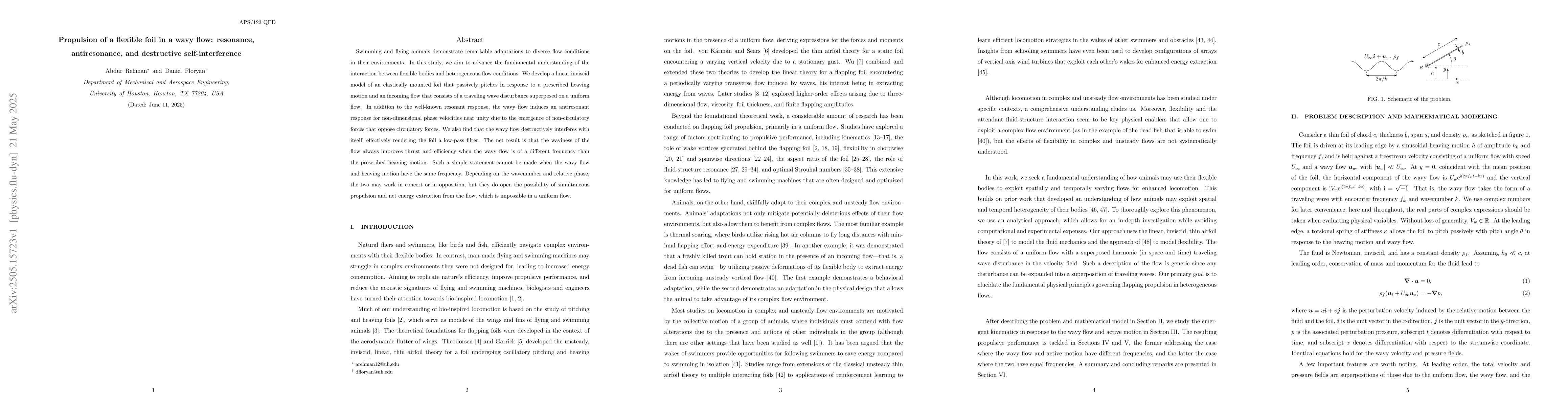 The research develops a linear inviscid model of an elastically mounted foil that passively pitches in response to a prescribed heaving motion and an incoming flow consisting of a traveling wave disturbance superposed on a uniform flow.