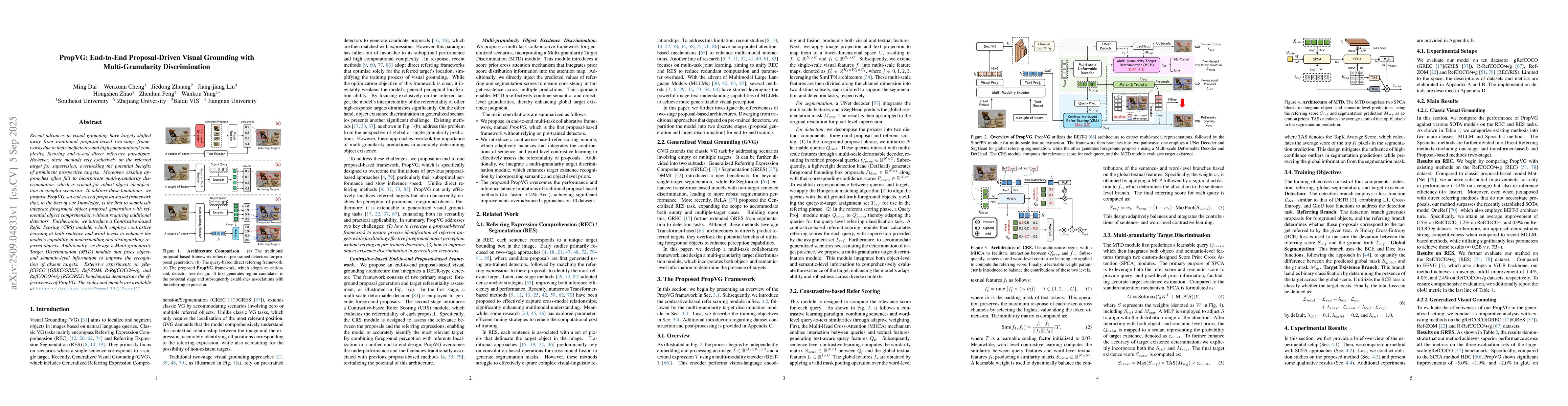 Recent advances in visual grounding have largely shifted away from traditional proposal-based two-stage frameworks due to their inefficiency and high computational complexity, favoring end-to-end direct reference paradigms. However, these methods rely exclusively on the referred target for supervision, overlooking the potential benefits of prominent prospective targets. Moreover, existing approaches often fail to incorporate multi-granularity discrimination, which is crucial for robust object identification in complex scenarios. To address these limitations, we propose PropVG, an end-to-end proposal-based framework that, to the best of our knowledge, is the first to seamlessly integrate foreground object proposal generation with referential object comprehension without requiring additional detectors. Furthermore, we introduce a Contrastive-based Refer Scoring (CRS) module, which employs contrastive learning at both sentence and word levels to enhance the capability in understanding and distinguishing referred objects. Additionally, we design a Multi-granularity Target Discrimination (MTD) module that fuses object- and semantic-level information to improve the recognition of absent targets. Extensive experiments on gRefCOCO (GREC/GRES), Ref-ZOM, R-RefCOCO, and RefCOCO (REC/RES) benchmarks demonstrate the effectiveness of PropVG. The codes and models are available at https://github.com/Dmmm1997/PropVG.