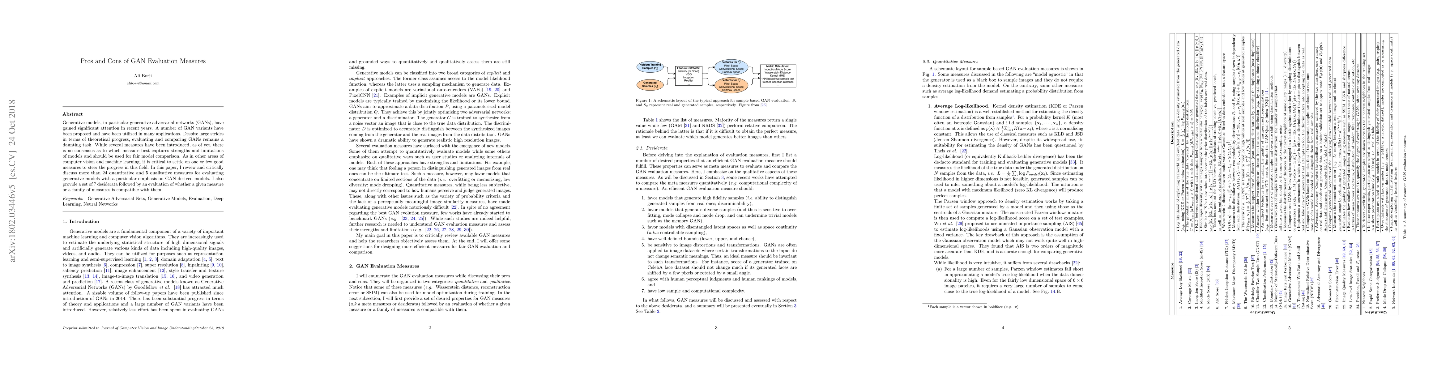 A review of 24+ quantitative and 5 qualitative measures for evaluating generative models, including GANs, identifies compatibility with desiderata for model comparison, aiming to settle on a consensus measure for fair model comparison.