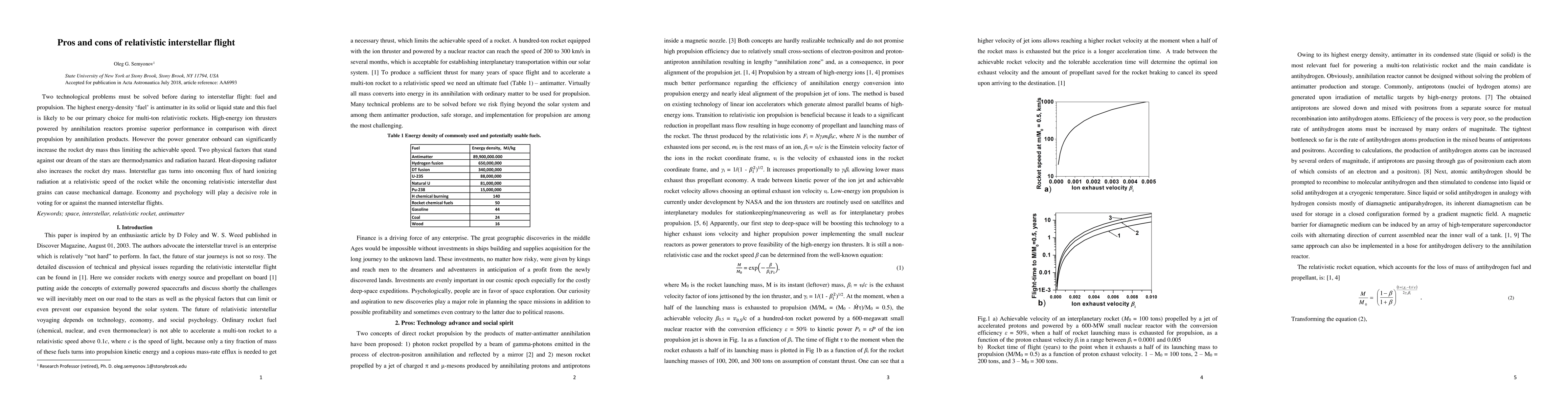 This paper discusses the challenges of interstellar flight, focusing on fuel and propulsion, particularly the use of antimatter and high-energy ion thrusters, while highlighting the increased dry mass and associated speed limitations. It also addresses the thermodynamic and radiation hazards, as well as the economic and psychological factors that will determine the feasibility of manned interstellar missions.