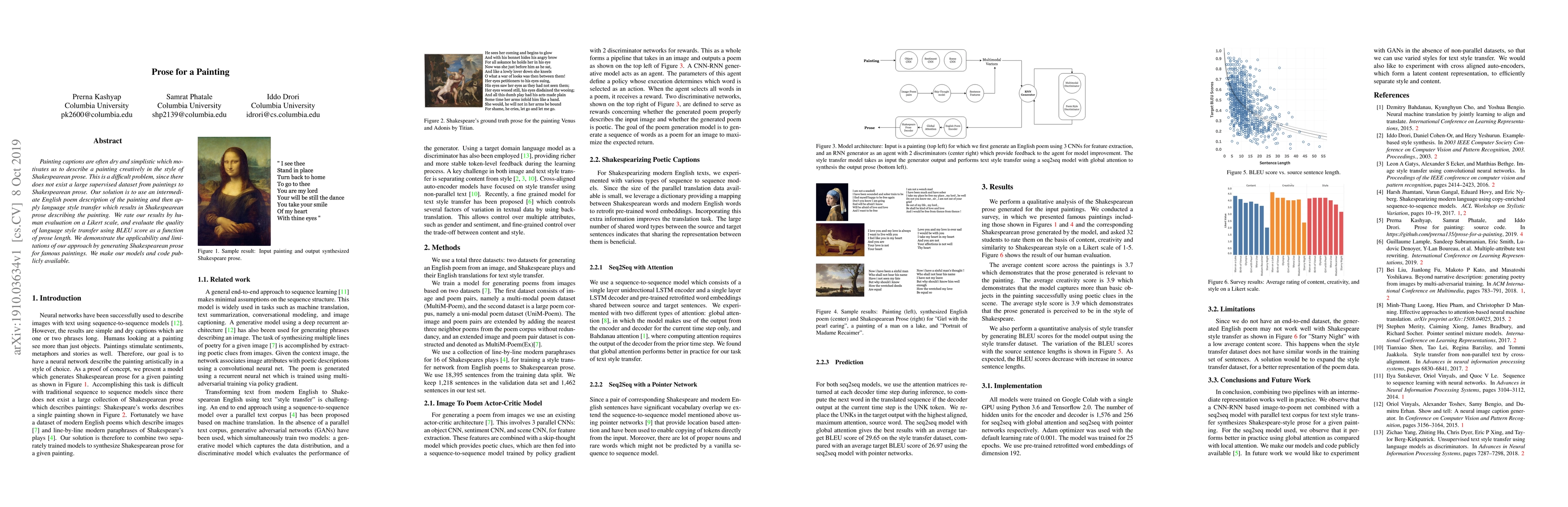 Painting captions are often dry and simplistic which motivates us to describe a painting creatively in the style of Shakespearean prose. This is a difficult problem, since there does not exist a large supervised dataset from paintings to Shakespearean prose. Our solution is to use an intermediate English poem description of the painting and then apply language style transfer which results in Shakespearean prose describing the painting. We rate our results by human evaluation on a Likert scale, and evaluate the quality of language style transfer using BLEU score as a function of prose length. We demonstrate the applicability and limitations of our approach by generating Shakespearean prose for famous paintings. We make our models and code publicly available.
