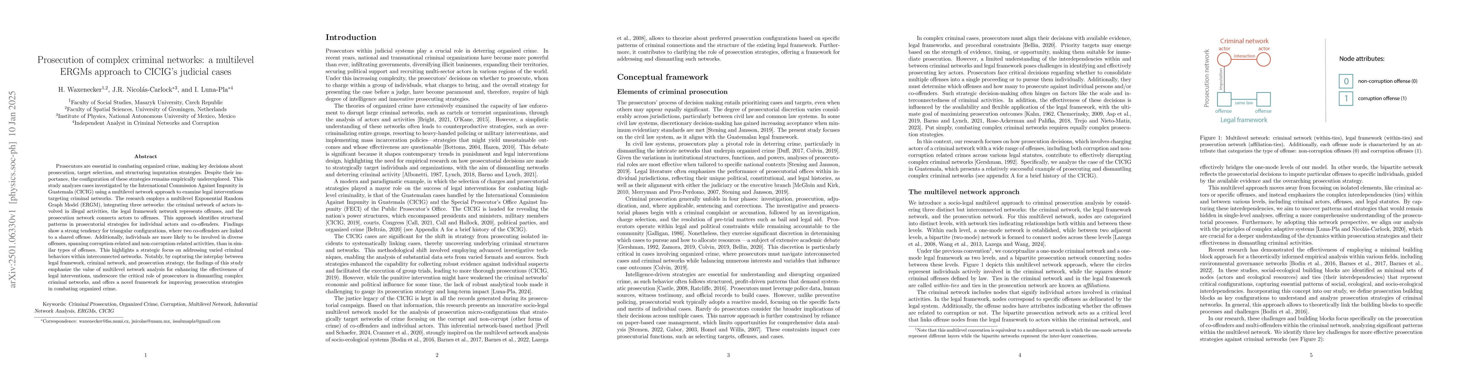 This study uses a multilevel Exponential Random Graph Model to analyze CICIG's judicial cases, revealing strategic prosecutorial patterns within criminal networks. It finds a preference for targeting diverse offenses and interconnected criminal behaviors, highlighting the importance of multilevel network analysis for effective legal interventions.