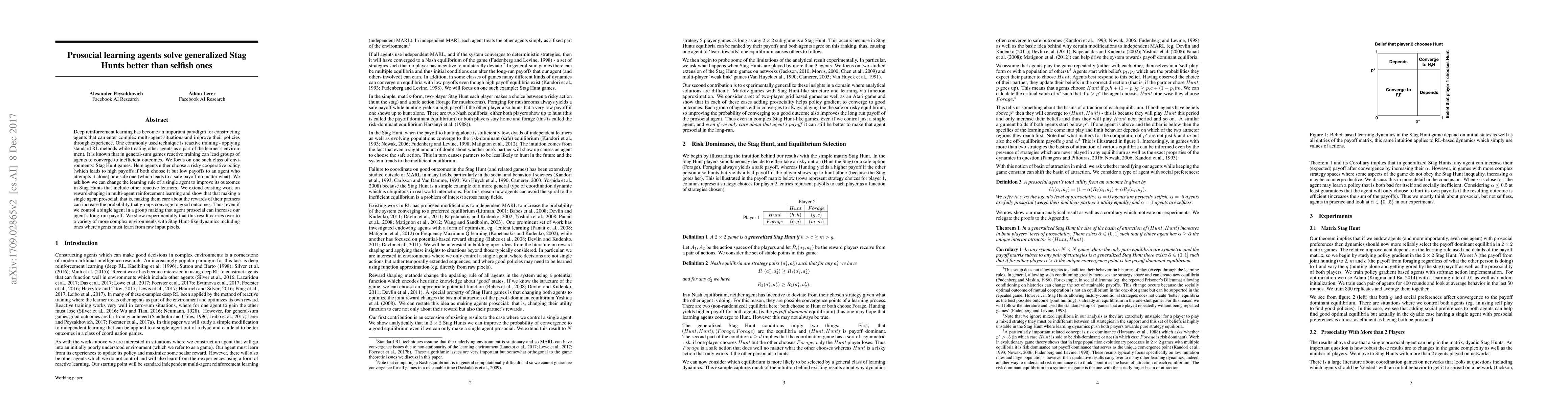 Deep reinforcement learning has become an important paradigm for constructing agents that can enter complex multi-agent situations and improve their policies through experience. One commonly used technique is reactive training - applying standard RL methods while treating other agents as a part of the learner's environment. It is known that in general-sum games reactive training can lead groups of agents to converge to inefficient outcomes. We focus on one such class of environments: Stag Hunt games. Here agents either choose a risky cooperative policy (which leads to high payoffs if both choose it but low payoffs to an agent who attempts it alone) or a safe one (which leads to a safe payoff no matter what). We ask how we can change the learning rule of a single agent to improve its outcomes in Stag Hunts that include other reactive learners. We extend existing work on reward-shaping in multi-agent reinforcement learning and show that that making a single agent prosocial, that is, making them care about the rewards of their partners can increase the probability that groups converge to good outcomes. Thus, even if we control a single agent in a group making that agent prosocial can increase our agent's long-run payoff. We show experimentally that this result carries over to a variety of more complex environments with Stag Hunt-like dynamics including ones where agents must learn from raw input pixels.