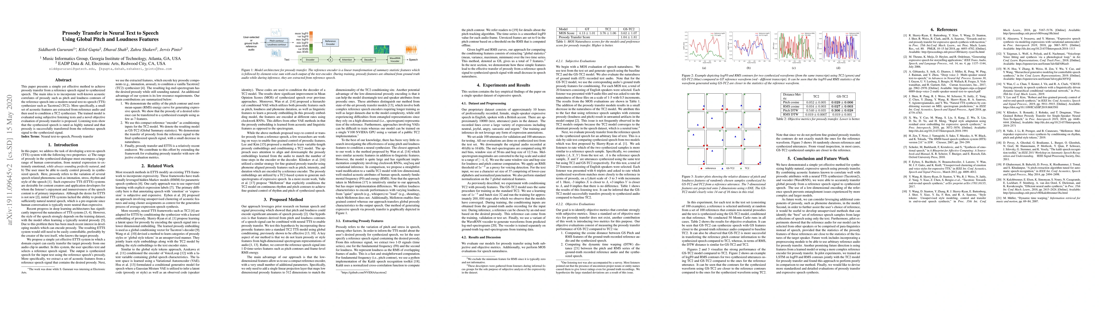 This paper proposes a method to transfer prosody from a reference speech signal to a synthesized speech using Tacotron2, by incorporating global pitch and loudness features. Evaluations show successful prosody transfer and high naturalness ratings in the synthesized speech.