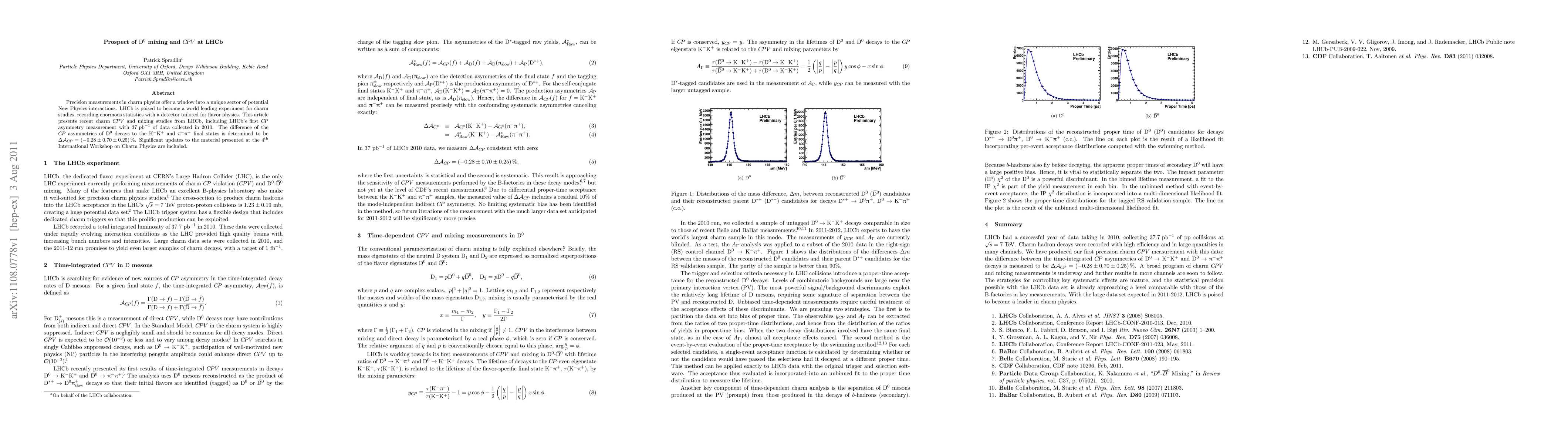 Precision measurements in charm physics offer a window into a unique sector of potential New Physics interactions. LHCb is poised to become a world leading experiment for charm studies, recording enormous statistics with a detector tailored for flavor physics. This article presents recent charm CPV and mixing studies from LHCb, including LHCb's first CP asymmetry measurement with 37 inverse pb of data collected in 2010. The difference of the CP asymmetries of D0 decays to the K-K+ and \pi-\pi+ final states is determined to be \Delta A_{CP} = (-0.28 +/- 0.70 +/- 0.25)%. Significant updates to the material presented at the 4th International Workshop on Charm Physics are included.