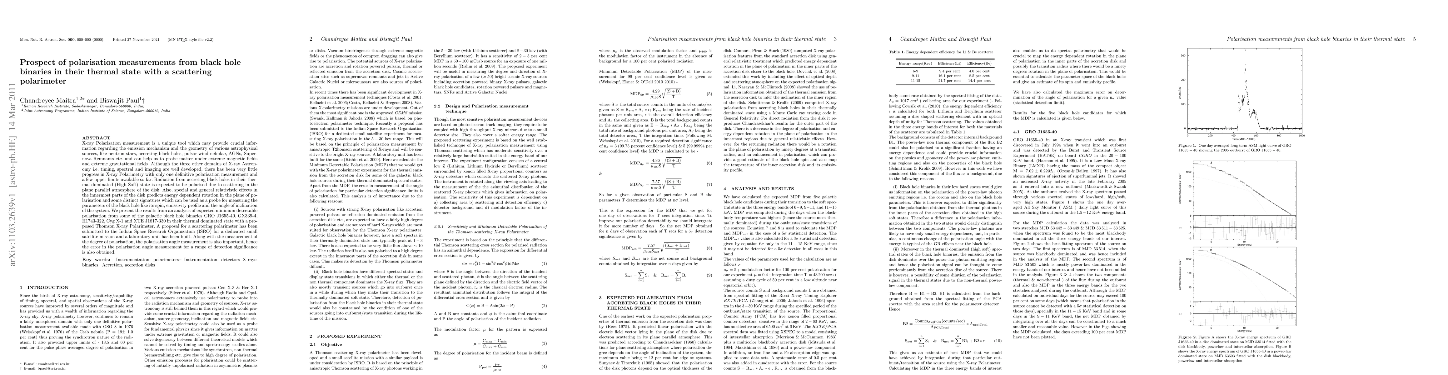X-ray polarisation measurement is a unique tool which may provide crucial information regarding the emission mechanism and the geometry of various astrophysical sources, like neutron stars, accreting black holes, pulsar wind nebulae, AGNs, Supernova Remnants etc. and can help us to probe matter under extreme magnetic fields and extreme gravitational fields. Although the three other domains of X-ray Astronomy i.e. timing, spectral and imaging are well developed, there has been very little progress in X-ray Polarimetry with only one definitive polarisation measurement and a few upper limits available so far. Radiation from accreting black holes in their thermal dominated (High Soft) state is expected to be polarised due to scattering in the plane parallel atmosphere of the disk. Also, special and general relativistic effects in the innermost parts of the disk predicts energy dependent rotation in the plane of polarisation and some distinct signatures which can be used as a probe for measuring the parameters of the black hole like its spin, emissivity profile and the angle of inclination of the system. We present the results from an analysis of expected minimum detectable polarisation from some of the galactic black hole binaries GRO J1655-40, GX339-4, H1743-322, Cyg X-1 and XTE J1817-330 in their thermal dominated state with a proposed Thomson X-ray Polarimeter. A proposal for a scattering polarimeter has been submitted to the Indian Space Research Organization (ISRO) for a dedicated small satellite mission and a laboratory unit has been built. Along with the measurement of the degree of polarisation, the polarisation angle measurement is also important, hence the error in the polarisation angle measurement for a range of detection significance is also obtained.