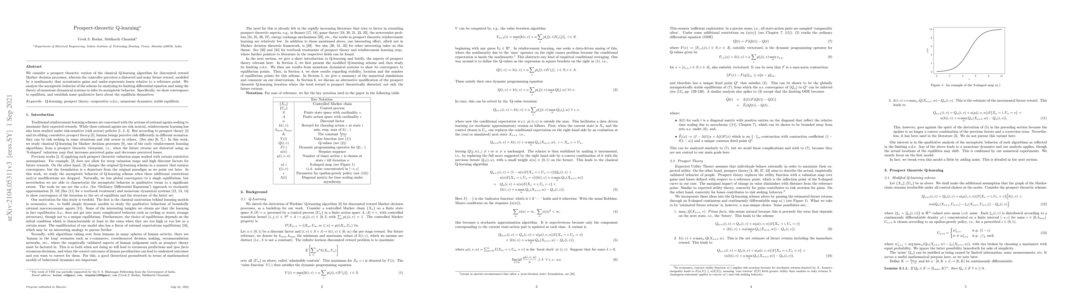 This paper introduces a prospect-theoretic Q-learning algorithm that models decision-making in uncertain environments. It demonstrates convergence to equilibria and provides insight into the behavior of these equilibria under specific conditions.