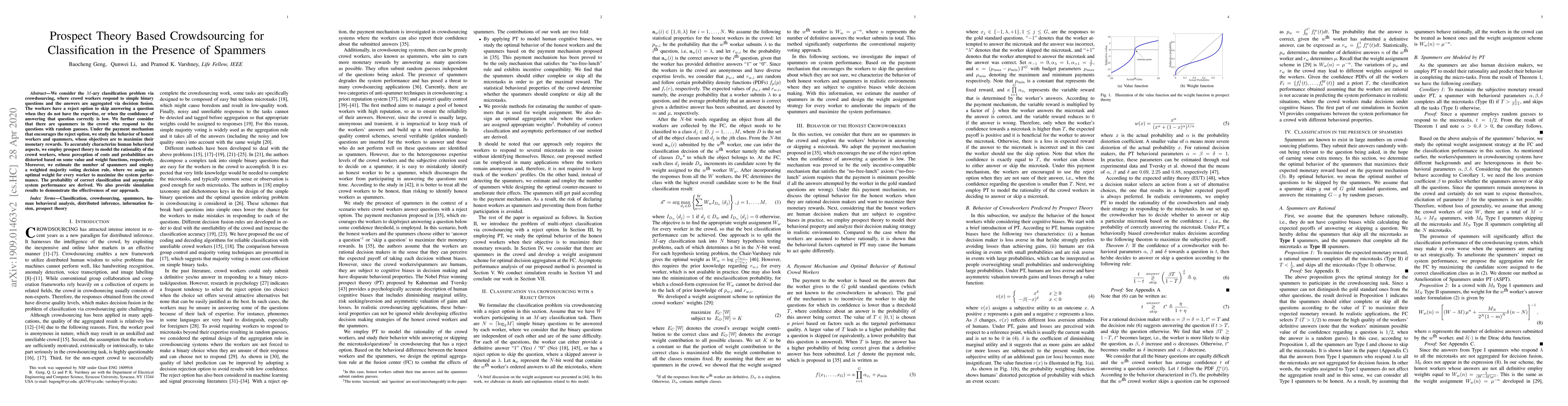 This research paper uses prospect theory to model crowd workers' behavior in a classification task affected by spammers, proposing a decision rule that maximizes system performance through weighted majority voting. The study aims to estimate the number of spammers and improve accuracy in crowdsourced classification tasks.