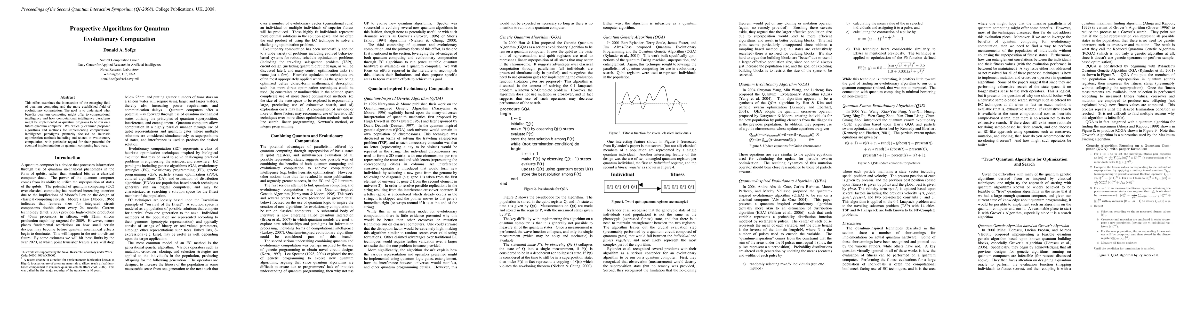 This effort examines the intersection of the emerging field of quantum computing and the more established field of evolutionary computation. The goal is to understand what benefits quantum computing might offer to computational intelligence and how computational intelligence paradigms might be implemented as quantum programs to be run on a future quantum computer. We critically examine proposed algorithms and methods for implementing computational intelligence paradigms, primarily focused on heuristic optimization methods including and related to evolutionary computation, with particular regard for their potential for eventual implementation on quantum computing hardware.
