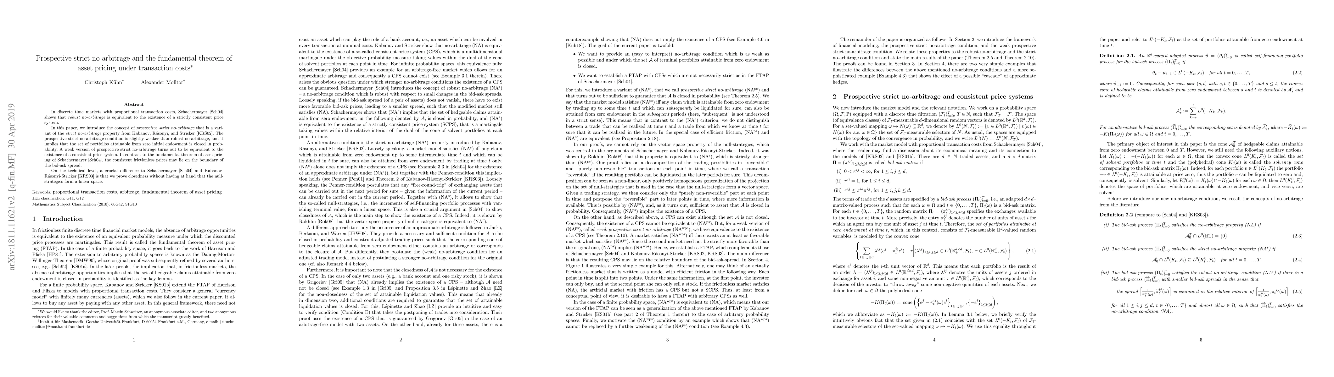 In discrete time markets with proportional transaction costs, Schachermayer (2004) shows that robust no-arbitrage is equivalent to the existence of a strictly consistent price system. In this paper, we introduce the concept of prospective strict no-arbitrage that is a variant of the strict no-arbitrage property from Kabanov, R\'asonyi, and Stricker (2002). The prospective strict no-arbitrage condition is slightly weaker than robust no-arbitrage, and it implies that the set of portfolios attainable from zero initial endowment is closed in probability. A weak version of prospective strict no-arbitrage turns out to be equivalent to the existence of a consistent price system. In contrast to the fundamental theorem of asset pricing of Schachermayer (2004), the consistent frictionless prices may lie on the boundary of the bid-ask spread. On the technical level, a crucial difference to Schachermayer (2004) and Kabanov-R\'asonyi-Stricker (2003) is that we prove closedness without having at hand that the null-strategies form a linear space.