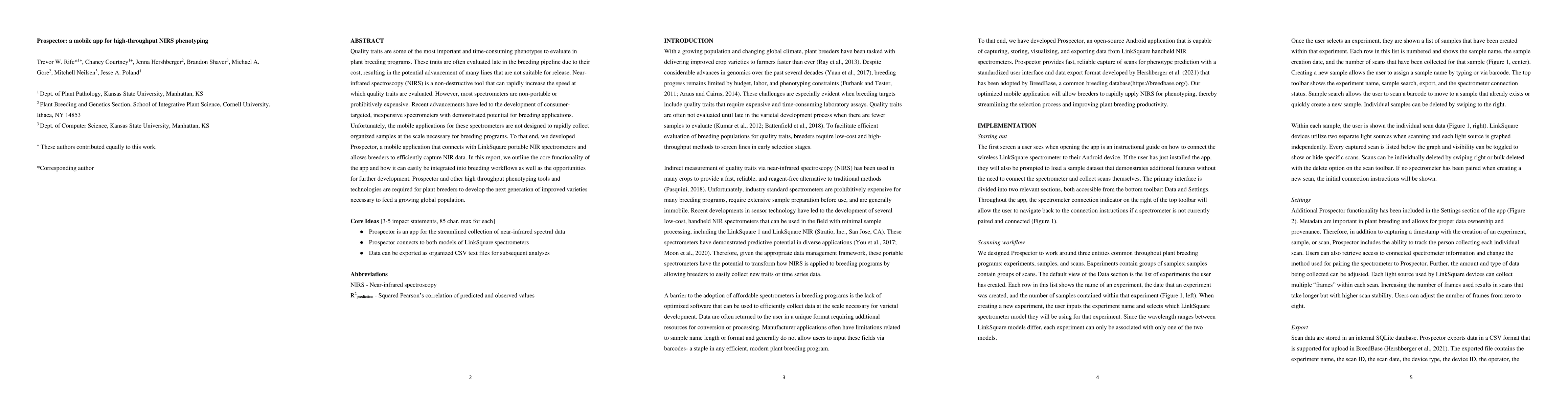 Quality traits are some of the most important and time-consuming phenotypes to evaluate in plant breeding programs. These traits are often evaluated late in the breeding pipeline due to their cost, resulting in the potential advancement of many lines that are not suitable for release. Near-infrared spectroscopy (NIRS) is a non-destructive tool that can rapidly increase the speed at which quality traits are evaluated. However, most spectrometers are non-portable or prohibitively expensive. Recent advancements have led to the development of consumer-targeted, inexpensive spectrometers with demonstrated potential for breeding applications. Unfortunately, the mobile applications for these spectrometers are not designed to rapidly collect organized samples at the scale necessary for breeding programs. To that end, we developed Prospector, a mobile application that connects with LinkSquare portable NIR spectrometers and allows breeders to efficiently capture NIR data. In this report, we outline the core functionality of the app and how it can easily be integrated into breeding workflows as well as the opportunities for further development. Prospector and other high throughput phenotyping tools and technologies are required for plant breeders to develop the next generation of improved varieties necessary to feed a growing global population.
