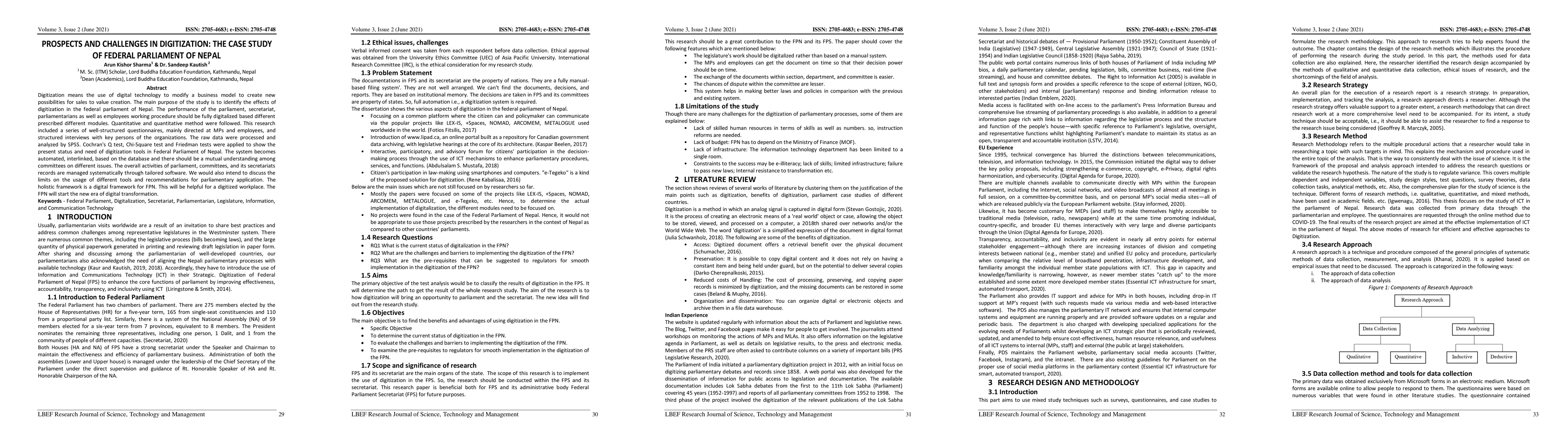 Digitization means the use of digital technology to modify a business model to create new possibilities for sales to value creation. The main purpose of the study is to identify the effects of digitization in the federal parliament of Nepal. The performance of the parliament, secretariat, parliamentarians as well as employees working procedure should be fully digitalized based different prescribed different modules. Quantitative and quantitative method were followed. This research included a series of well-structured questionnaires, mainly directed at MPs and employees, and structured interviews with key persons of the organizations. The raw data were processed and analyzed by SPSS. Cochran's Q test, Chi-Square test and Friedman tests were applied to show the present status and need of digitization tools in Federal Parliament of Nepal. The system becomes automated, interlinked, based on the database and there should be a mutual understanding among committees on different issues. The overall activities of parliament, committees, and its secretariats records are managed systematically through tailored software. We would also intend to discuss the limits on the usage of different tools and recommendations for parliamentary application. The holistic framework is a digital framework for FPN. This will be helpful for a digitized workplace. The FPN will start the new era of digital transformation. Keywords - Federal Parliament, Digitalization, Secretariat, Parliamentarian, Legislature, Information, and Communication Technology