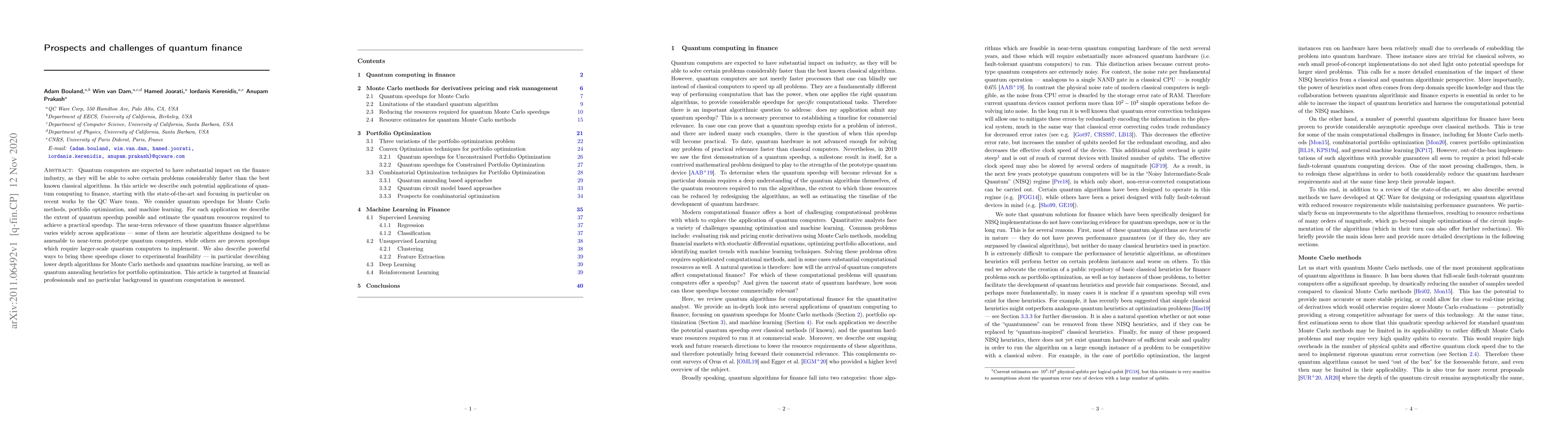 Quantum computers are expected to have substantial impact on the finance industry, as they will be able to solve certain problems considerably faster than the best known classical algorithms. In this article we describe such potential applications of quantum computing to finance, starting with the state-of-the-art and focusing in particular on recent works by the QC Ware team. We consider quantum speedups for Monte Carlo methods, portfolio optimization, and machine learning. For each application we describe the extent of quantum speedup possible and estimate the quantum resources required to achieve a practical speedup. The near-term relevance of these quantum finance algorithms varies widely across applications - some of them are heuristic algorithms designed to be amenable to near-term prototype quantum computers, while others are proven speedups which require larger-scale quantum computers to implement. We also describe powerful ways to bring these speedups closer to experimental feasibility - in particular describing lower depth algorithms for Monte Carlo methods and quantum machine learning, as well as quantum annealing heuristics for portfolio optimization. This article is targeted at financial professionals and no particular background in quantum computation is assumed.
