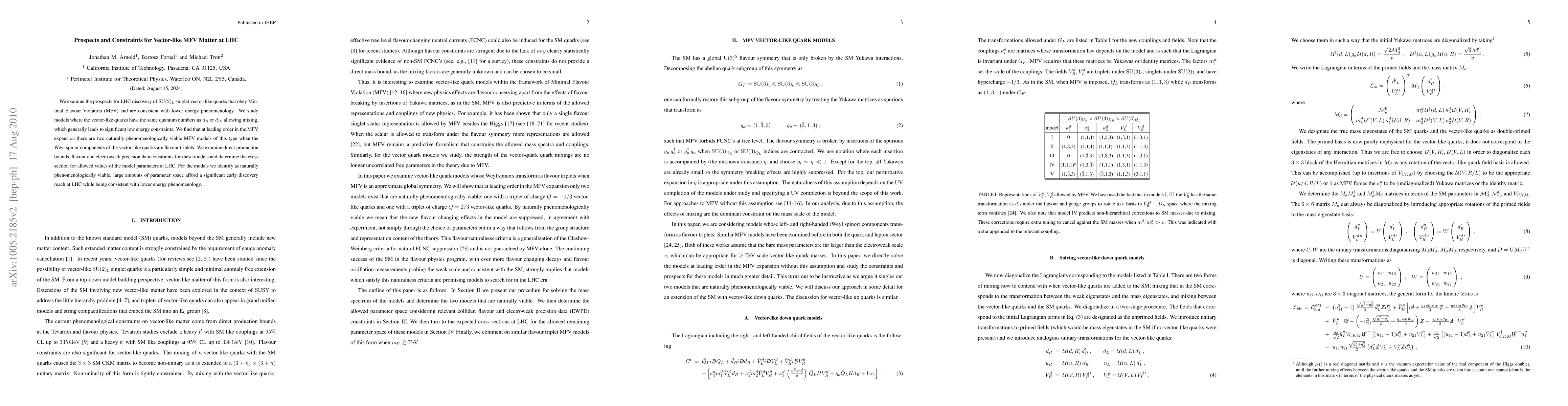 We examine the prospects for LHC discovery of SU(2)_L singlet vector-like quarks that obey Minimal Flavour Violation (MFV) and are consistent with lower energy phenomenology. We study models where the vector-like quarks have the same quantum numbers as u_R or d_R, allowing mixing, which generally leads to significant low energy constraints. We find that there are two naturally phenomenologically viable MFV models of this type when the Weyl spinor components of the vector-like quarks are flavour triplets. We examine direct production bounds, flavour and electroweak precision data constraints for these models and determine the cross section for allowed values of the model parameters at LHC. For the models we identify as naturally phenomenologically viable, large amounts of parameter space afford a significant early discovery reach at LHC while being consistent with lower energy phenomenology.