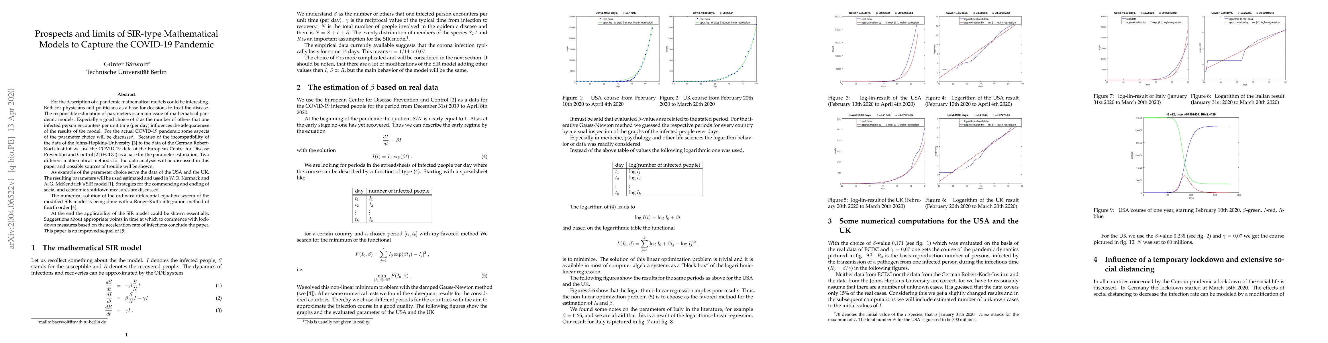 For the description of a pandemic mathematical models could be interesting. Both for physicians and politicians as a base for decisions to treat the disease. The responsible estimation of parameters is a main issue of mathematical pandemic models. Especially a good choice of $\beta$ as the number of others that one infected person encounters per unit time (per day) influences the adequateness of the results of the model. For the actual COVID-19 pandemic some aspects of the parameter choice will be discussed. Because of the incompatibility of the data of the Johns-Hopkins-University to the data of the German Robert-Koch-Institut we use the COVID-19 data of the European Centre for Disease Prevention and Control (ECDC) as a base for the parameter estimation. Two different mathematical methods for the data analysis will be discussed in this paper and possible sources of trouble will be shown. As example of the parameter choice serve the data of the USA and the UK. The resulting parameters will be used estimated and used in W.\,O. Kermack and A.\,G. McKendrick's SIR model. Strategies for the commencing and ending of social and economic shutdown measures are discussed. The numerical solution of the ordinary differential equation system of the modified SIR model is being done with a Runge-Kutta integration method of fourth order. At the end the applicability of the SIR model could be shown essentially. Suggestions about appropriate points in time at which to commence with lockdown measures based on the acceleration rate of infections conclude the paper.