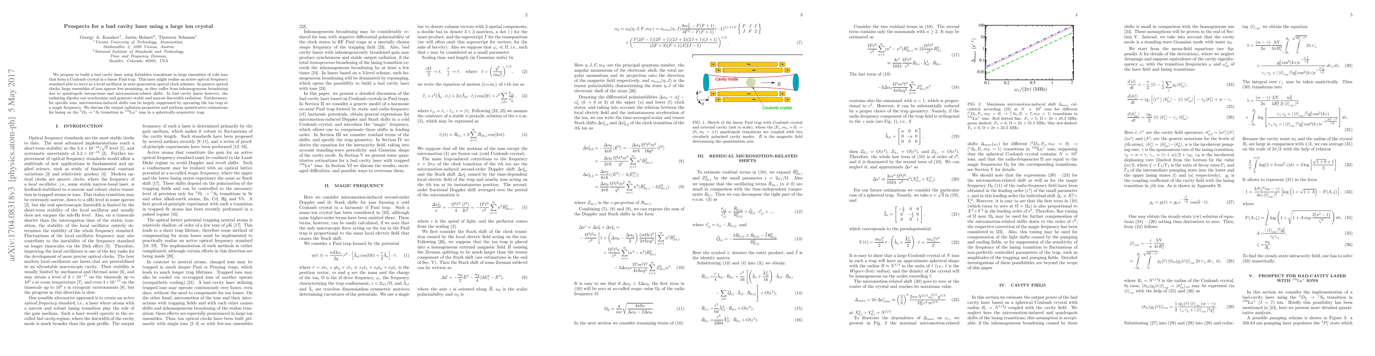 This paper proposes a bad cavity laser utilizing forbidden transitions in large ensembles of cold ions forming a Coulomb crystal in a linear Paul trap, which could serve as an active optical frequency standard. The study suggests that bad cavity lasers can overcome inhomogeneous broadening issues and achieve stable, narrow-linewidth radiation, potentially surpassing passive optical clocks.