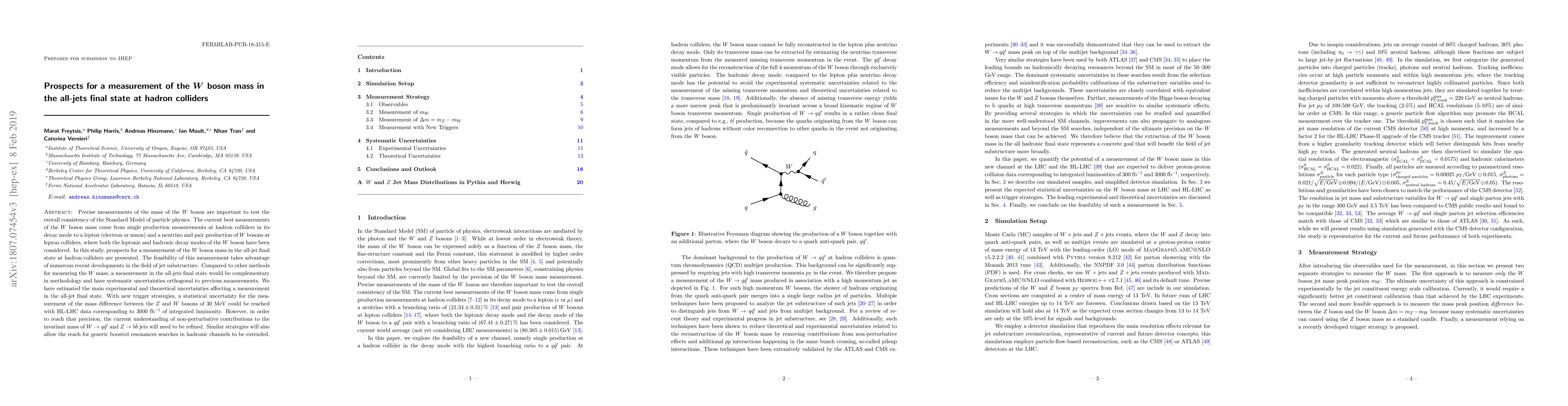 This paper explores the potential for measuring the $W$ boson mass in the all-jets final state at hadron colliders, leveraging recent advancements in jet substructure. It estimates that with new trigger strategies and sufficient data, a precision of 30 MeV in the mass difference between $Z$ and $W$ bosons could be achieved, though refinements in understanding non-perturbative contributions are required.
