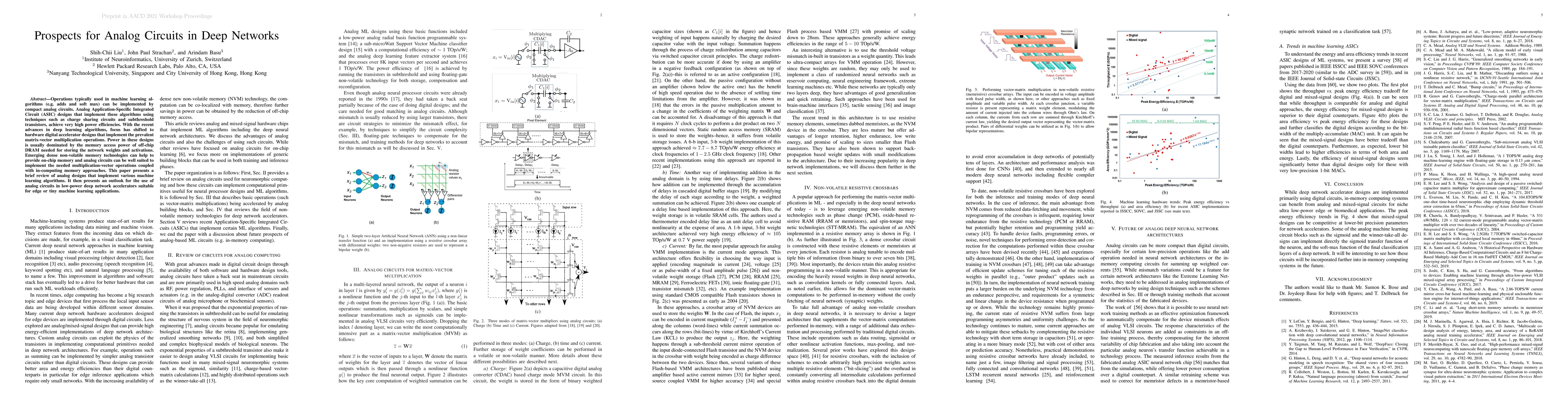 Analog circuits can efficiently implement machine learning algorithms, especially in low-power deep network accelerators suitable for edge applications. Emerging non-volatile memory technologies may enable on-chip storage, making analog circuits a promising solution for power-efficient ML processing.