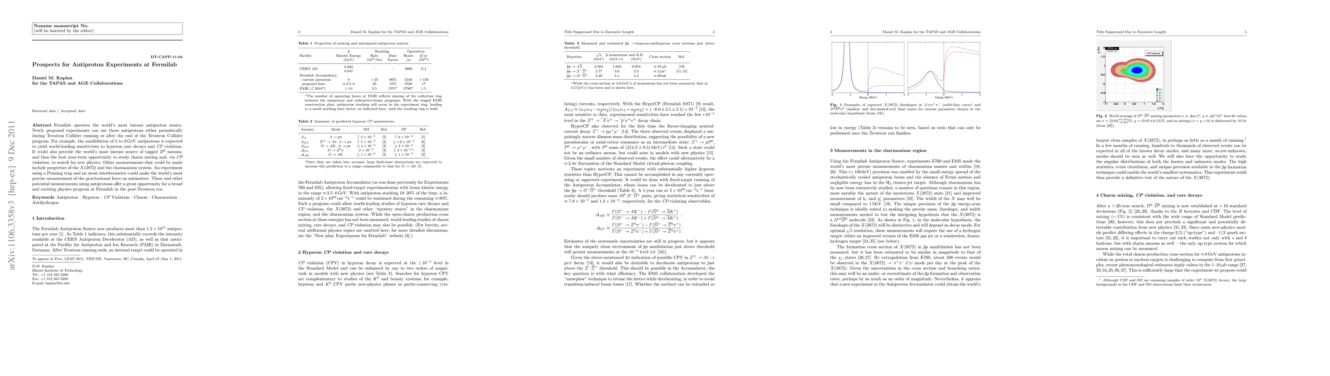 Fermilab operates the world's most intense antiproton source. Newly proposed experiments can use those antiprotons either parasitically during Tevatron Collider running or after the end of the Tevatron Collider program. For example, the annihilation of 5 to 8 GeV antiprotons is expected to yield world-leading sensitivities to hyperon rare decays and CP violation. It could also provide the world's most intense source of tagged D^0 mesons, and thus the best near-term opportunity to study charm mixing and, via CP violation, to search for new physics. Other measurements that could be made include properties of the X(3872) and the charmonium system. An experiment using a Penning trap and an atom interferometer could make the world's most precise measurement of the gravitational force on antimatter. These and other potential measurements using antiprotons offer a great opportunity for a broad and exciting physics program at Fermilab in the post-Tevatron era.