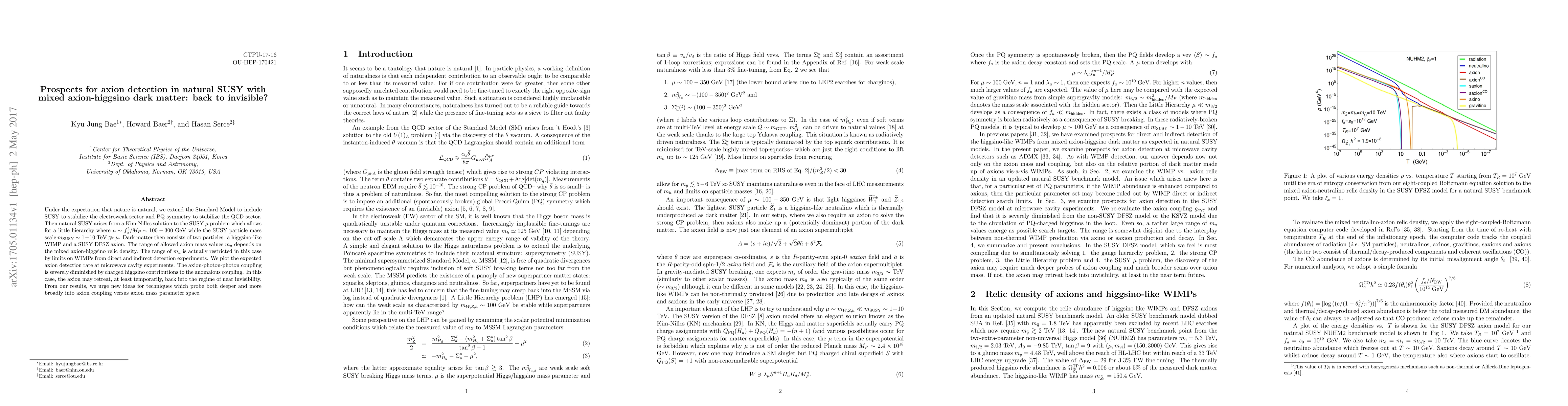 Under the expectation that nature is natural, we extend the Standard Model to include SUSY to stabilize the electroweak sector and PQ symmetry to stabilize the QCD sector. Then natural SUSY arises from a Kim-Nilles solution to the SUSY mu problem which allows for a little hierarchy where mu ~ f_a^2/M_P ~ 100-300 GeV while the SUSY particle mass scale m(SUSY)~ 1-10 TeV >> mu. Dark matter then consists of two particles: a higgsino-like WIMP and a SUSY DFSZ axion. The range of allowed axion mass values m(axion) depends on the mixed axion-higgsino relic density. The range of m(axion) is actually restricted in this case by limits on WIMPs from direct and indirect detection experiments. We plot the expected axion detection rate at microwave cavity experiments. The axion-photon-photon coupling is severely diminished by charged higgsino contributions to the anomalous coupling. In this case, the axion may retreat, at least temporarily, back into the regime of near invisibility. From our results, we urge new ideas for techniques which probe both deeper and more broadly into axion coupling versus axion mass parameter space.