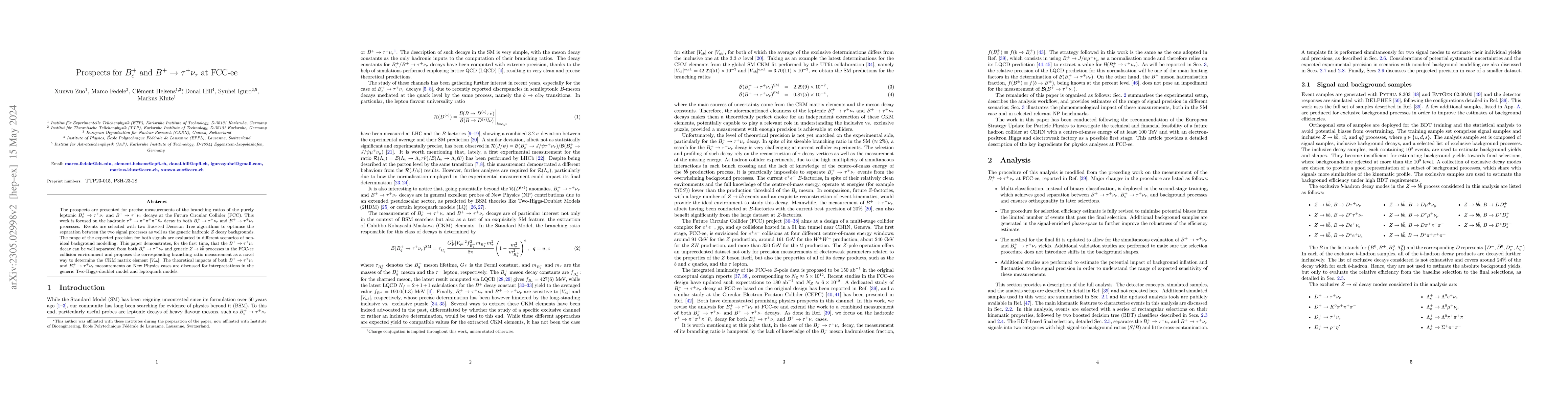 This paper explores the prospects for measuring the branching ratios of $B_c^+$ and $B^+$ decays to $\tau^+ \nu_\tau$ at FCC-ee, focusing on optimizing event selection using Boosted Decision Trees. It demonstrates the feasibility of separating $B^+ \to \tau^+ \nu_\tau$ from background processes and proposes this as a method to determine the CKM matrix element $|V_{ub}|$, while discussing implications for New Physics models.