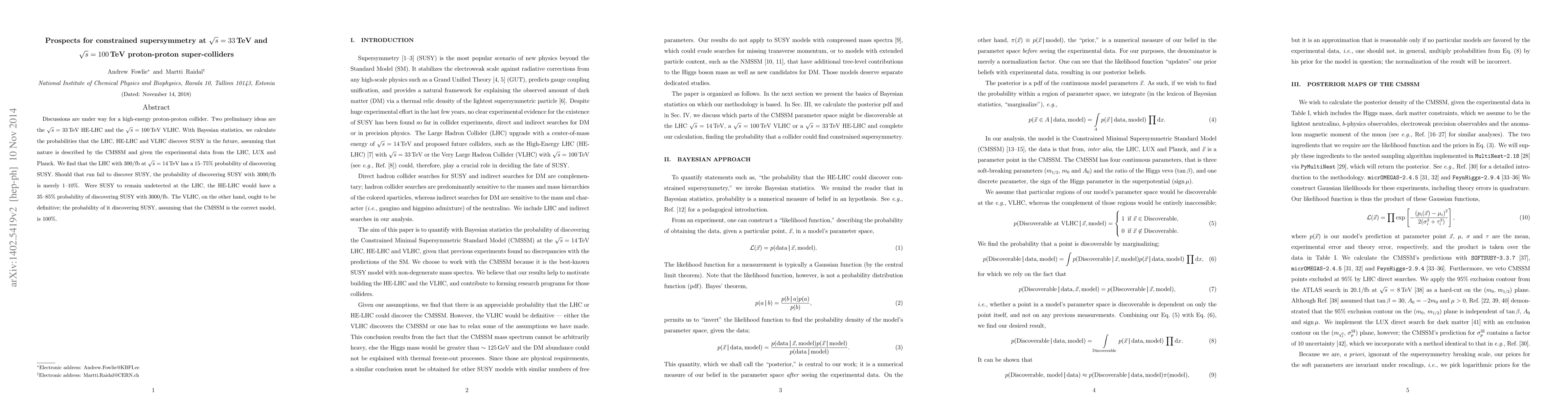 This paper assesses the likelihood of discovering constrained supersymmetry (SUSY) at the LHC, HE-LHC, and VLHC using Bayesian statistics. It finds that while the current LHC has a moderate chance of discovering SUSY, the HE-LHC and especially the VLHC offer significantly higher probabilities, with the VLHC being virtually certain to detect SUSY if it exists.