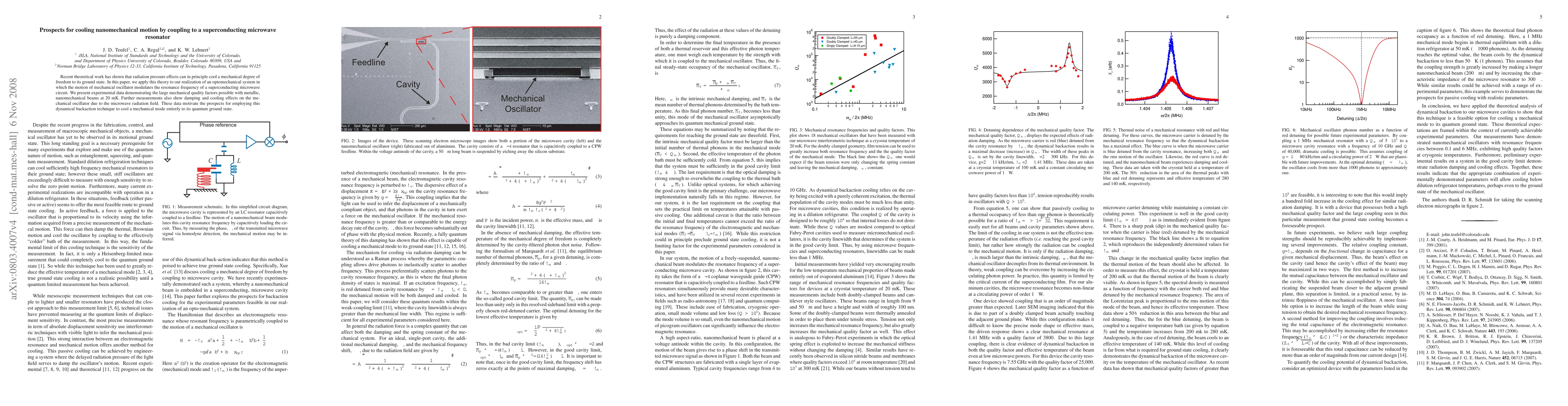 Recent theoretical work has shown that radiation pressure effects can in principle cool a mechanical degree of freedom to its ground state. In this paper, we apply this theory to our realization of an opto-mechanical system in which the motion of mechanical oscillator modulates the resonance frequency of a superconducting microwave circuit. We present experimental data demonstrating the large mechanical quality factors possible with metallic, nanomechanical beams at 20 mK. Further measurements also show damping and cooling effects on the mechanical oscillator due to the microwave radiation field. These data motivate the prospects for employing this dynamical backaction technique to cool a mechanical mode entirely to its quantum ground state.