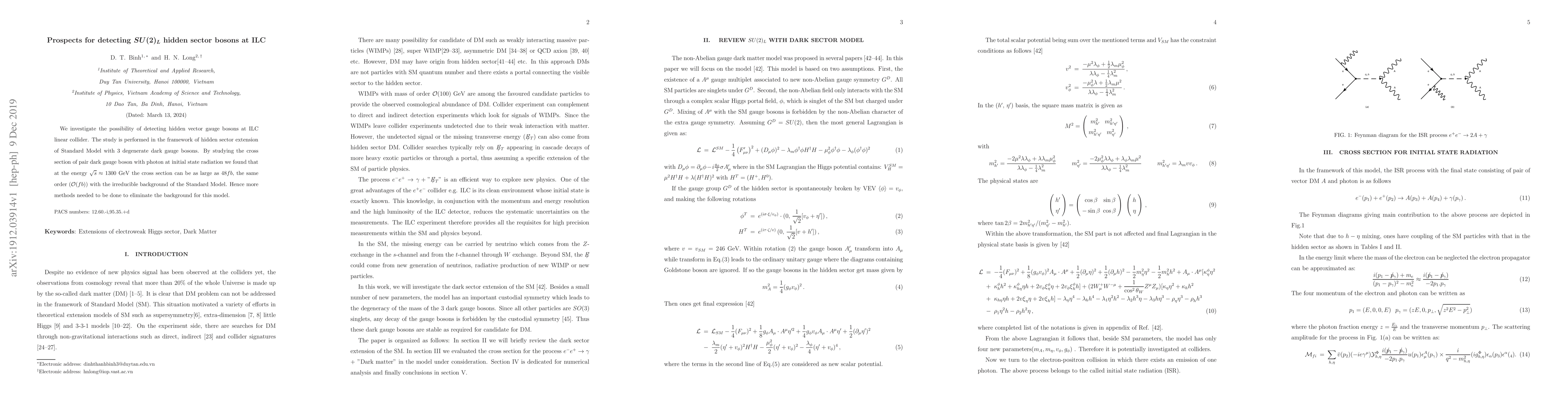 We investigate the possibility of detecting hidden vector gauge bosons at ILC linear collider. The study is performed in the framework of hidden sector extension of Standard Model with 3 degenerate dark gauge bosons. By studying the cross section of pair dark gauge boson with photon at initial state radiation we found that at the energy $\sqrt{s} \approx$ 1300 GeV the cross section can be as large as $48fb$, the same order ($\mathcal{O}(fb)$) with the irreducible background of the Standard Model. Hence more methods needed to be done to eliminate the background for this model.