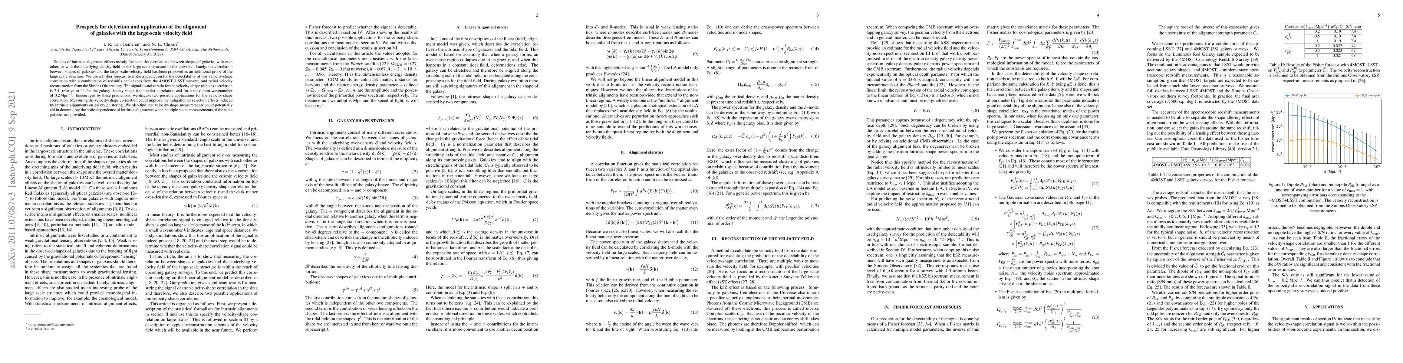 Studies of intrinsic alignment effects mostly focus on the correlations between shapes of galaxies with each other, or with the underlying density field of the large scale structure of the universe. Lately, the correlation between shapes of galaxies and the large-scale velocity field has been proposed as an additional probe of the large scale structure. We use a Fisher forecast to make a prediction for the detectability of this velocity-shape correlation with a combination of redshifts and shapes from the 4MOST+LSST surveys, and radial velocity reconstruction from the Simons Observatory. The signal-to-noise ratio for the velocity-shape (dipole) correlation is 7.4, relative to 44 for the galaxy density-shape (monopole) correlation and for a maximum wavenumber of $0.2\: \mathrm{Mpc^{-1}}$. Encouraged by these predictions, we discuss two possible applications for the velocity-shape correlation. Measuring the velocity-shape correlation could improve the mitigation of selection effects induced by intrinsic alignments on galaxy clustering. We also find that velocity-shape measurements could potentially aid in determining the scale-dependence of intrinsic alignments when multiple shape measurements of the same galaxies are provided.