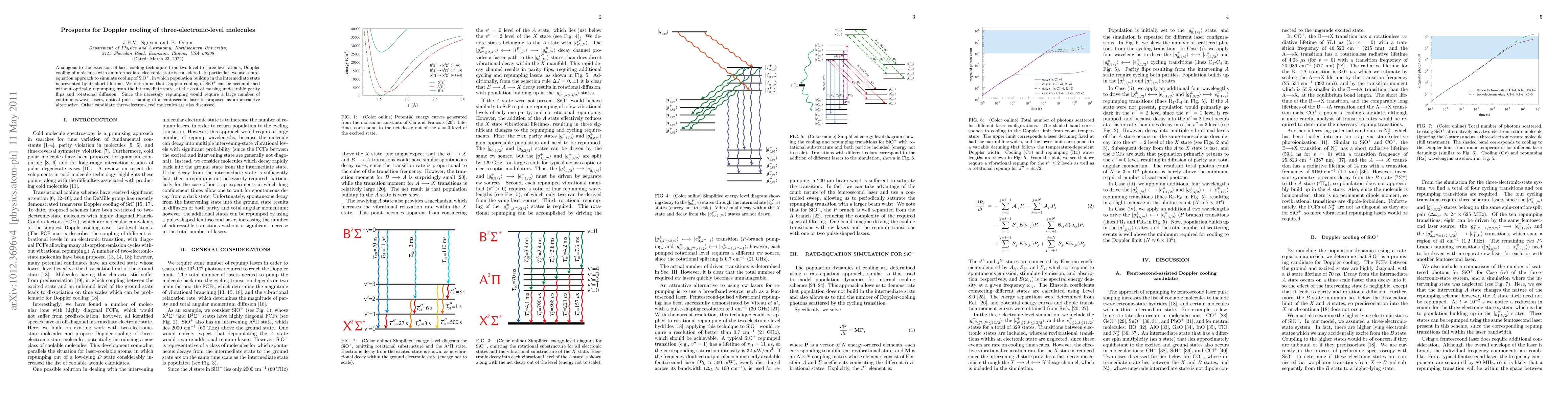 Analogous to the extension of laser cooling techniques from two-level to three-level atoms, Doppler cooling of molecules with an intermediate electronic state is considered. In particular, we use a rate-equation approach to simulate cooling of SiO+, in which population buildup in the intermediate state is prevented by its short lifetime. We determine that Doppler cooling of SiO+ can be accomplished without optically repumping from the intermediate state, at the cost of causing undesirable parity flips and rotational diffusion. Since the necessary repumping would require a large number of continuous-wave lasers, optical pulse shaping of a femtosecond laser is proposed as an attractive alternative. Other candidate three-electron-level molecules are also discussed.
