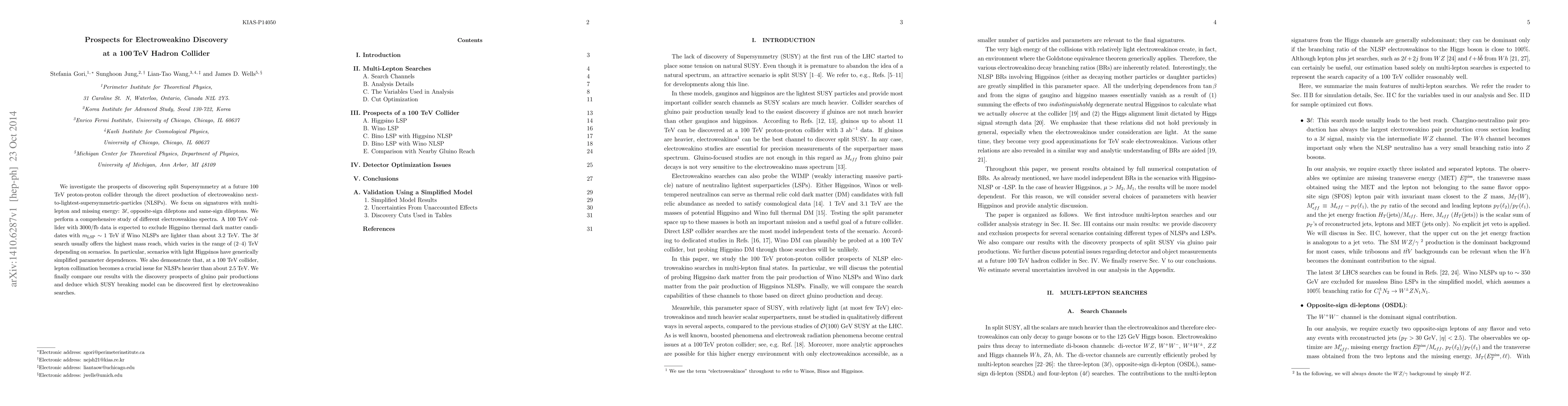 This paper explores the potential for discovering split Supersymmetry at a future 100 TeV proton-proton collider, focusing on the direct production of electroweakino NLSPs. The study highlights the $3\ell$ search as offering the highest mass reach, up to 4 TeV, and emphasizes the importance of lepton collimation for heavier NLSPs.