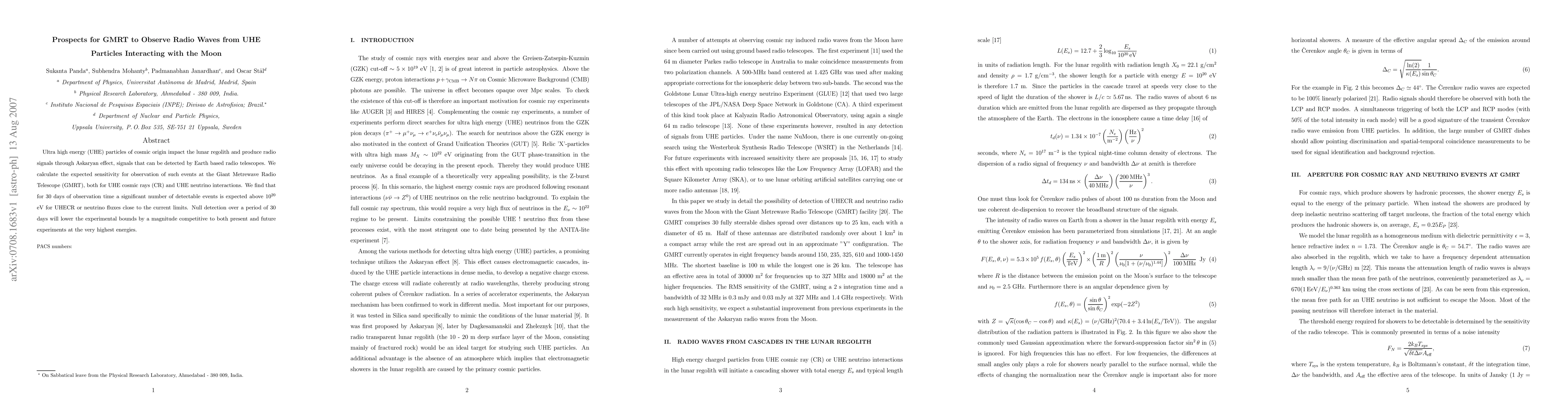 The Giant Metrewave Radio Telescope (GMRT) has a promising chance of detecting ultra-high energy particles interacting with the Moon, which could reveal new insights into cosmic origins. Detection or non-detection by GMRT over 30 days can significantly influence experimental bounds on UHE particle fluxes.