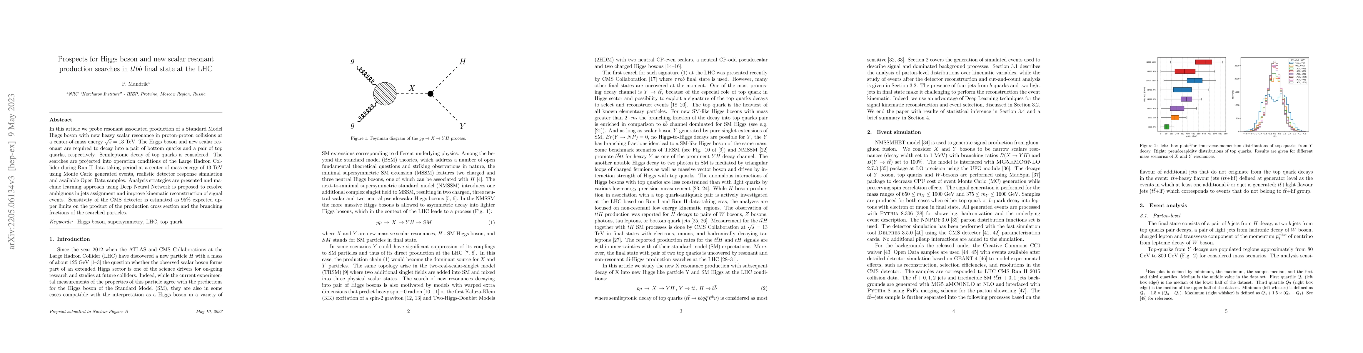 In this article we probe resonant associated production of a Standard Model Higgs boson with new heavy scalar resonant in proton-proton collisions at a center-of-mass energy $\sqrt{s} = 13$ TeV. The Higgs boson and new scalar resonant are required to decay into a pair of bottom quarks and a pair of top quarks, respectively. Semileptonic decay of top quarks is considered. The searches are projected into operation conditions of the Large Hadron Collider during Run II data taking period at a center-of-mass energy of 13 TeV using Monte Carlo generated events, realistic detector response simulation and available Open Data samples. Analysis strategies are summarized and machine learning approach using Deep Neural Network is proposed to resolve ambiguous in jets assignment and improve kinematic reconstruction of signal events. Sensitivity of the CMS detector is estimated as 95% expected upper limits on the product of the production cross section and the branching fractions of the searched process.