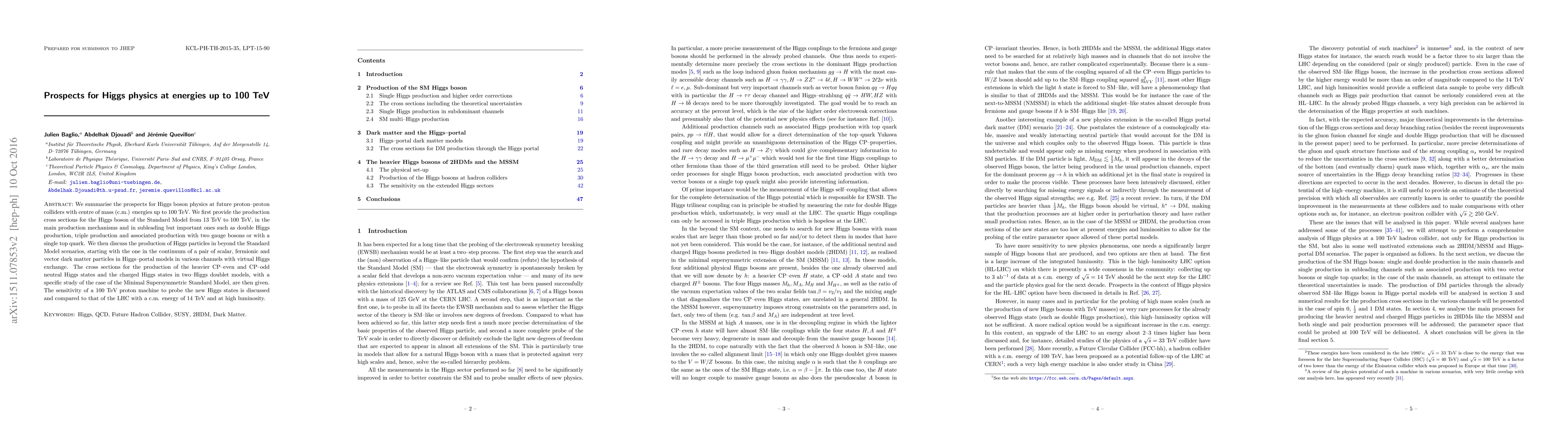 This paper reviews the potential for Higgs boson studies at future proton-proton colliders with energies up to 100 TeV, detailing production cross sections for Standard Model and beyond the Standard Model Higgs particles, and comparing the sensitivity of such a collider to that of the current LHC.