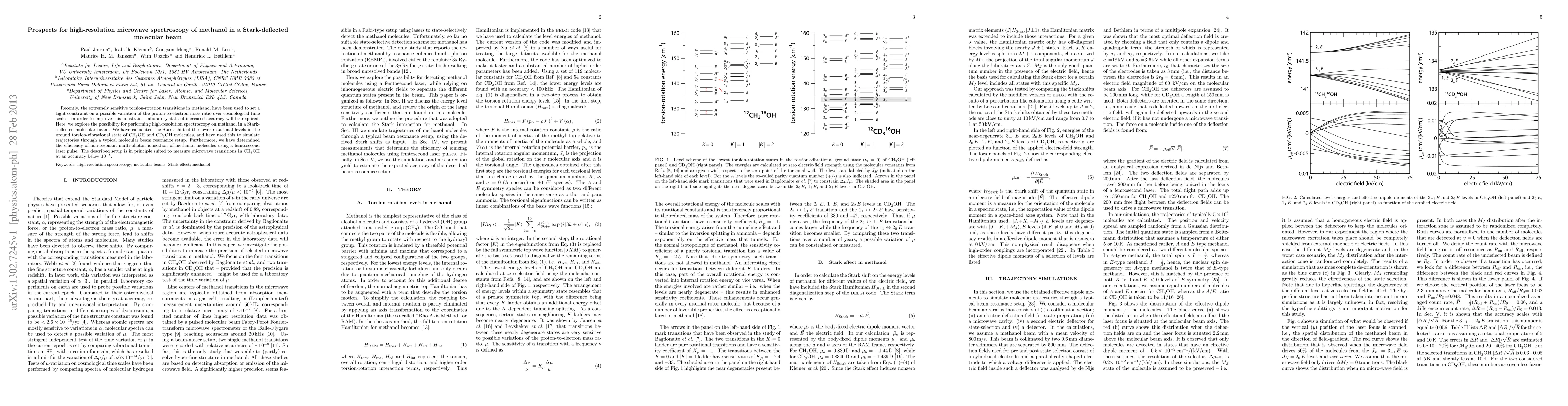 Recently, the extremely sensitive torsion-rotation transitions in methanol have been used to set a tight constraint on a possible variation of the proton-to-electron mass ratio over cosmological time scales. In order to improve this constraint, laboratory data of increased accuracy will be required. Here, we explore the possibility for performing high-resolution spectroscopy on methanol in a Stark-deflected molecular beam. We have calculated the Stark shift of the lower rotational levels in the ground torsion-vibrational state of CH3OH and CD3OH molecules, and have used this to simulate trajectories through a typical molecular beam resonance setup. Furthermore, we have determined the efficiency of non-resonant multi-photon ionization of methanol molecules using a femtosecond laser pulse. The described setup is in principle suited to measure microwave transitions in CH3OH at an accuracy below 10^{-8}.