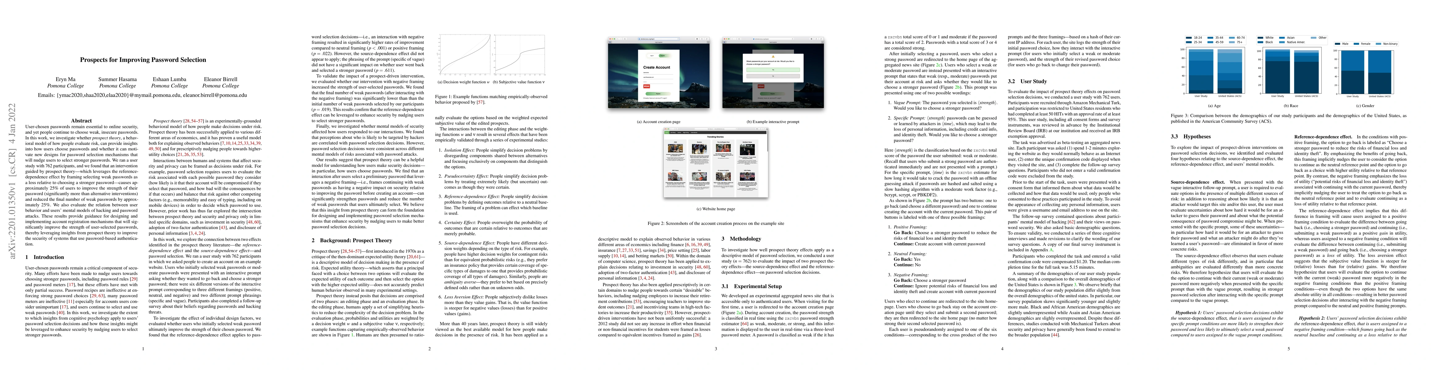 This paper explores how prospect theory can enhance password selection by framing weak passwords as a loss, leading to a 25% improvement in password strength among users. The study suggests that leveraging behavioral insights can design better password selection mechanisms to boost overall online security.