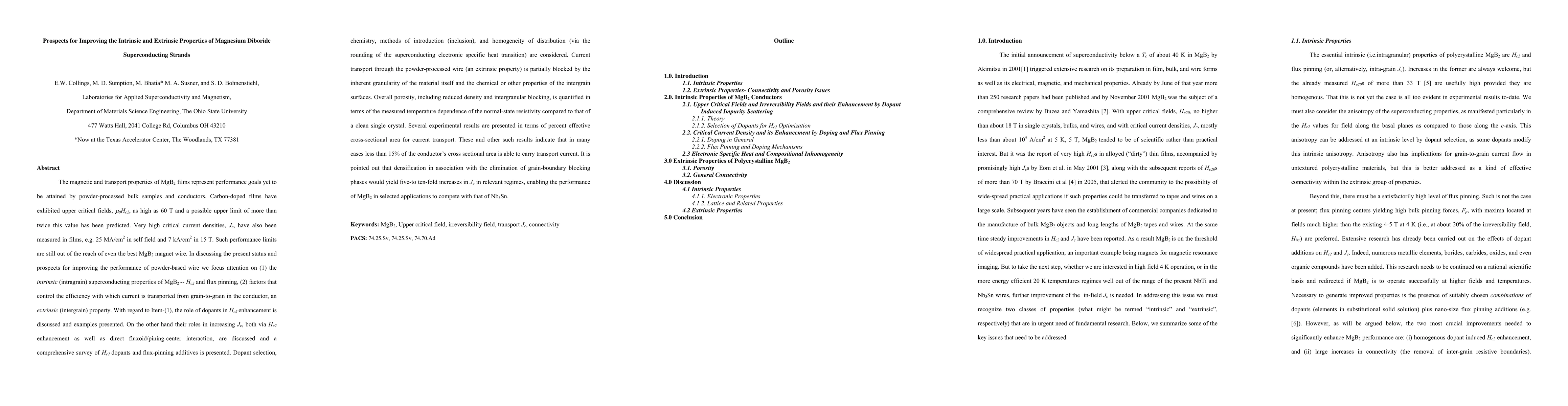 This paper explores methods to enhance the intrinsic and extrinsic properties of magnesium diboride superconducting strands, focusing on improving Hc2 and flux pinning through dopants, and addressing current transport efficiency across grain boundaries. Densification and elimination of grain-boundary blocking phases are suggested to significantly boost current-carrying capacity, potentially rivaling Nb-Sn performance.