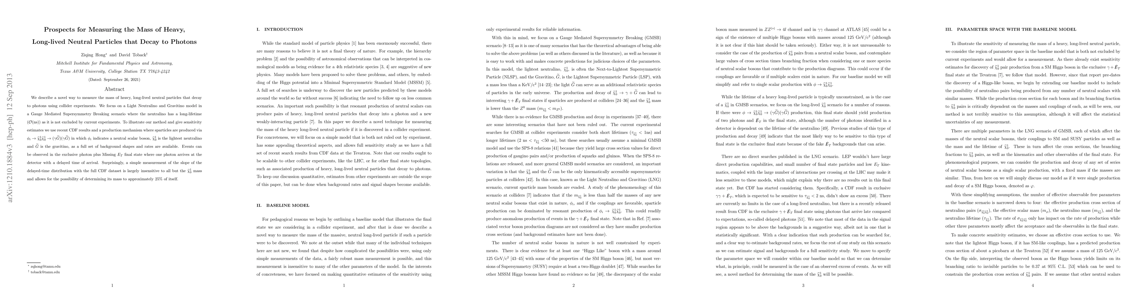 We describe a novel way to measure the mass of heavy, long-lived neutral particles that decay to photons using collider experiments. We focus on a Light Neutralino and Gravitino model in a Gauge Mediated Supersymmetry Breaking scenario where the neutralino has a long-lifetime (O(ns)) as it is not excluded by current experiments. To illustrate our method and give sensitivity estimates we use recent CDF results and a production mechanism where sparticles are produced via $\phi_{i} \rightarrow \widetilde{\chi}^{1}_{0} \widetilde{\chi}^{1}_{0} \rightarrow (\gamma \widetilde{G})(\gamma \widetilde{G})$ in which $\phi_{i}$ indicates a neutral scalar boson, $\widetilde{\chi}^{1}_{0}$ is the lightest neutralino and $\widetilde{G}$ is the gravitino, as a full set of background shapes and rates are available. Events can be observed in the exclusive photon plus Missing $E_{T}$ final state where one photon arrives at the detector with a delayed time of arrival. Surprisingly, a simple measurement of the slope of the delayed-time distribution with the full CDF dataset is largely insensitive to all but the $\widetilde{\chi}^{1}_{0}$ mass and allows for the possibility of determining its mass to approximately 25% of itself.