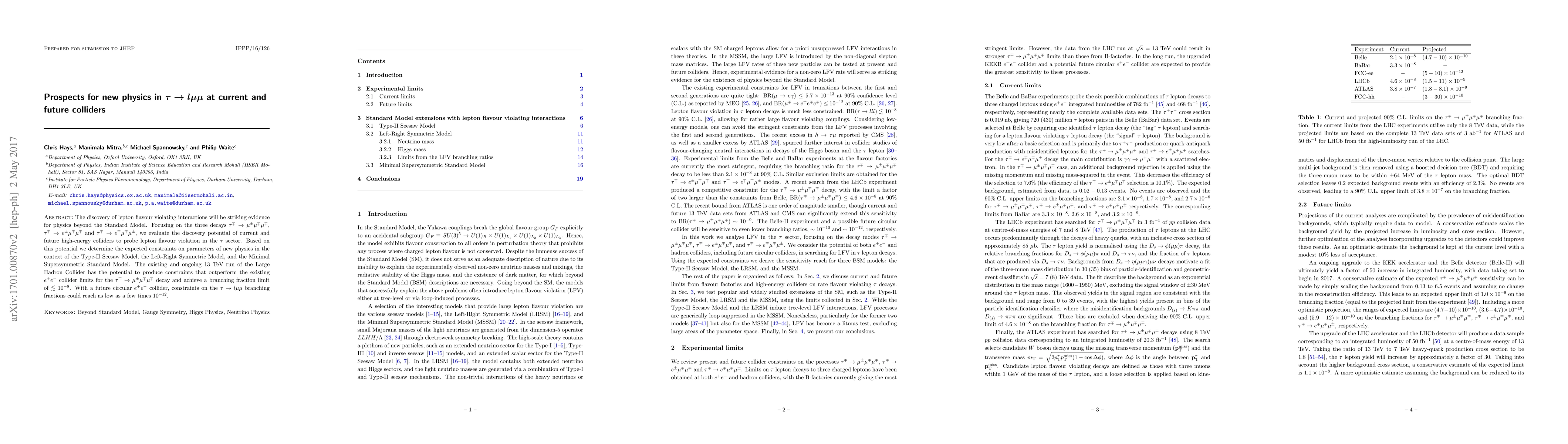 This paper evaluates the potential of current and future high-energy colliders to detect lepton flavor violating decays of tau leptons, specifically $\tau \to l \mu \mu$, as evidence for physics beyond the Standard Model. It projects that the 13 TeV LHC can outperform existing limits, while a future circular $e^+ e^-$ collider could achieve branching fraction limits of a few times $10^{-12}$.
