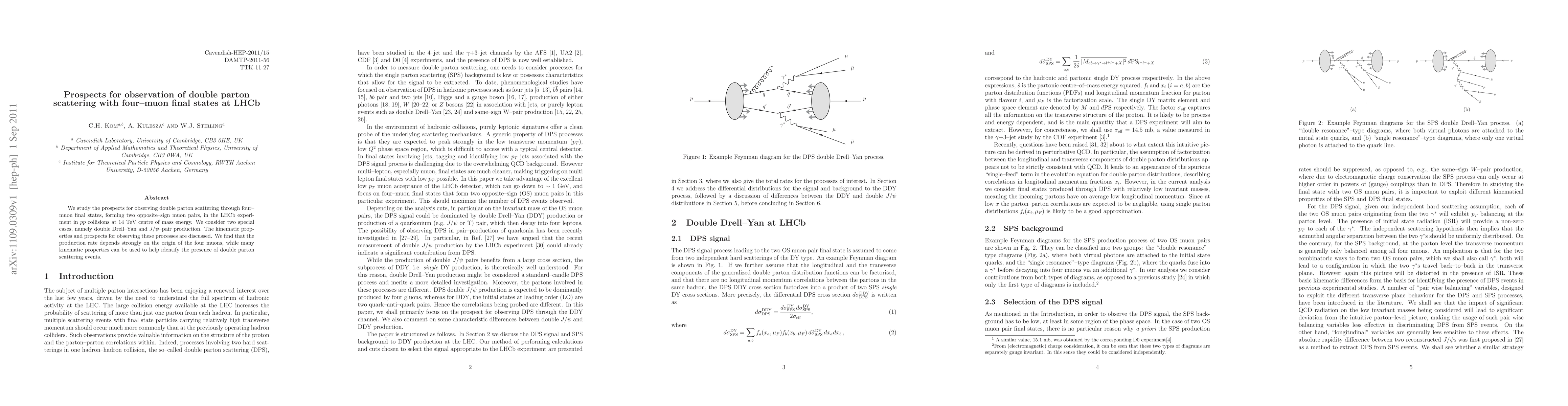 We study the prospects for observing double parton scattering through four-muon final states, forming two opposite-sign muon pairs, in the LHCb experiment in pp collisions at 14 TeV centre of mass energy. We consider two special cases, namely double Drell-Yan and J/psi-pair production. The kinematic properties and prospects for observing these processes are discussed. We find that the production rate depends strongly on the origin of the four muons, while many kinematic properties can be used to help identify the presence of double parton scattering events.