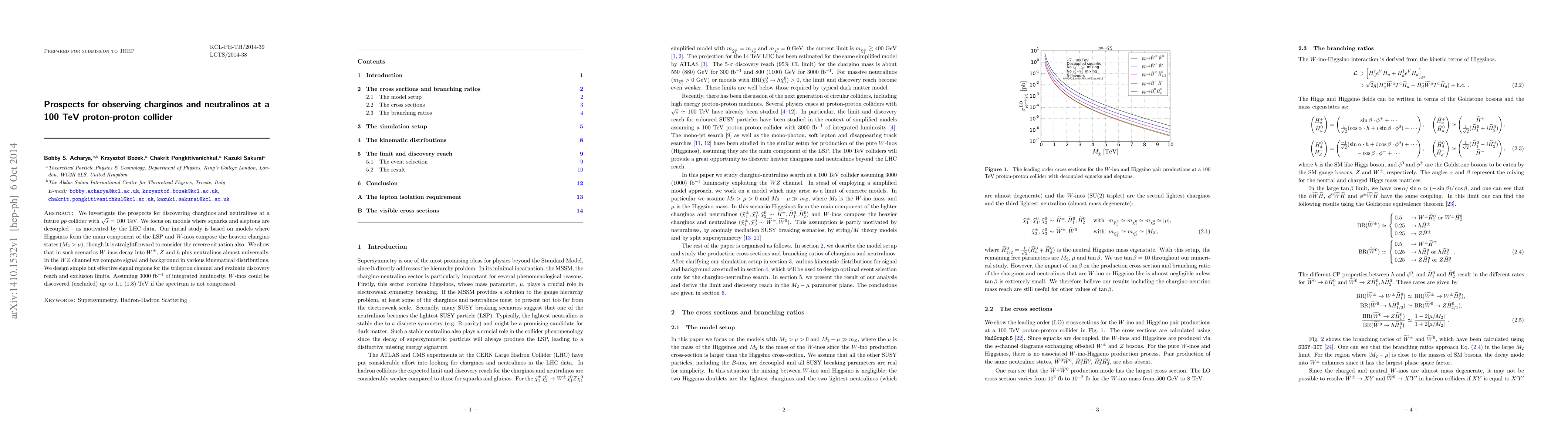 We investigate the prospects for discovering charginos and neutralinos at a future $pp$ collider with $\sqrt{s} = 100$ TeV. We focus on models where squarks and sleptons are decoupled -- as motivated by the LHC data. Our initial study is based on models where Higgsinos form the main component of the LSP and $W$-inos compose the heavier chargino states ($M_2 > \mu$), though it is straightforward to consider the reverse situation also. We show that in such scenarios $W$-inos decay into $W^\pm$, $Z$ and $h$ plus neutralinos almost universally. In the $W Z$ channel we compare signal and background in various kinematical distributions. We design simple but effective signal regions for the trilepton channel and evaluate discovery reach and exclusion limits. Assuming 3000 fb$^{-1}$ of integrated luminosity, $W$-inos could be discovered (excluded) up to 1.1 (1.8) TeV if the spectrum is not compressed.