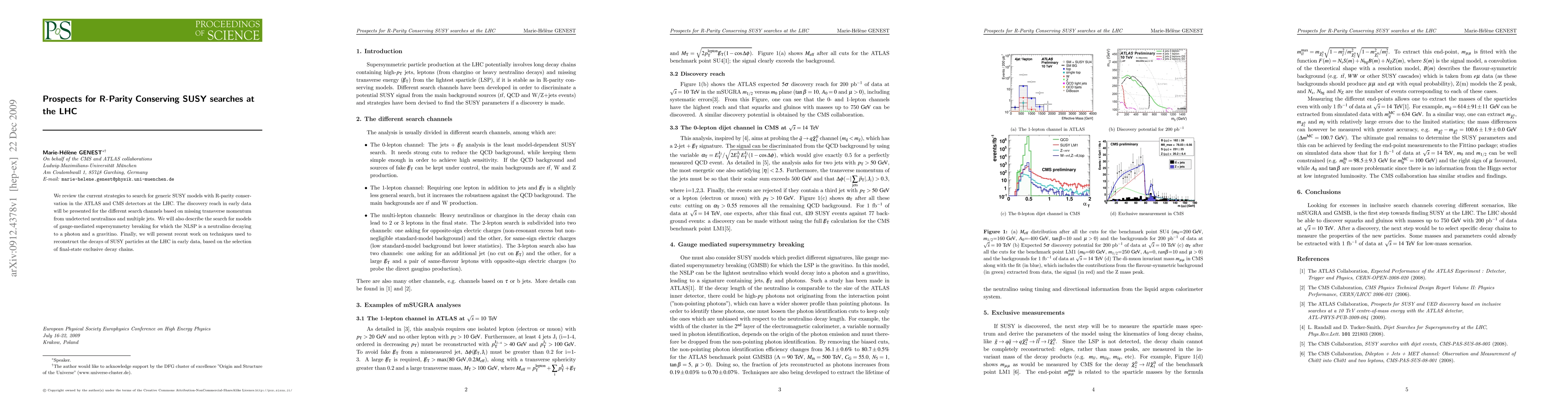 This paper reviews strategies for searching for R-parity conserving SUSY models at the LHC using ATLAS and CMS detectors, focusing on channels involving missing transverse momentum and multiple jets. It also discusses techniques for reconstructing SUSY particle decays and explores gauge-mediated supersymmetry breaking models.