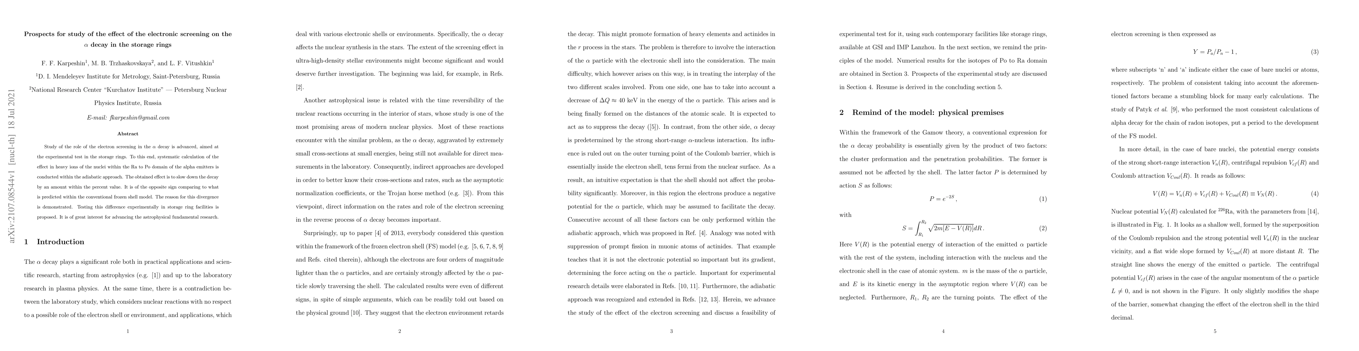 Study of the role of the electron screening in the $\alpha$ decay is advanced, aimed at the experimental test in the storage rings. To this end, systematic calculation of the effect in heavy ions of the nuclei within the Ra to Po domain of the $\alpha$ emitters is conducted within the adiabatic approach. The obtained effect is to slow down the decay by an amount within the percent value. It is of the opposite sign comparing to what is predicted within the conventional frozen shell model. The reason for this divergence is demonstrated. Testing this difference experimentally in storage ring facilities is proposed. It is of great interest for advancing the astrophysical fundamental research.