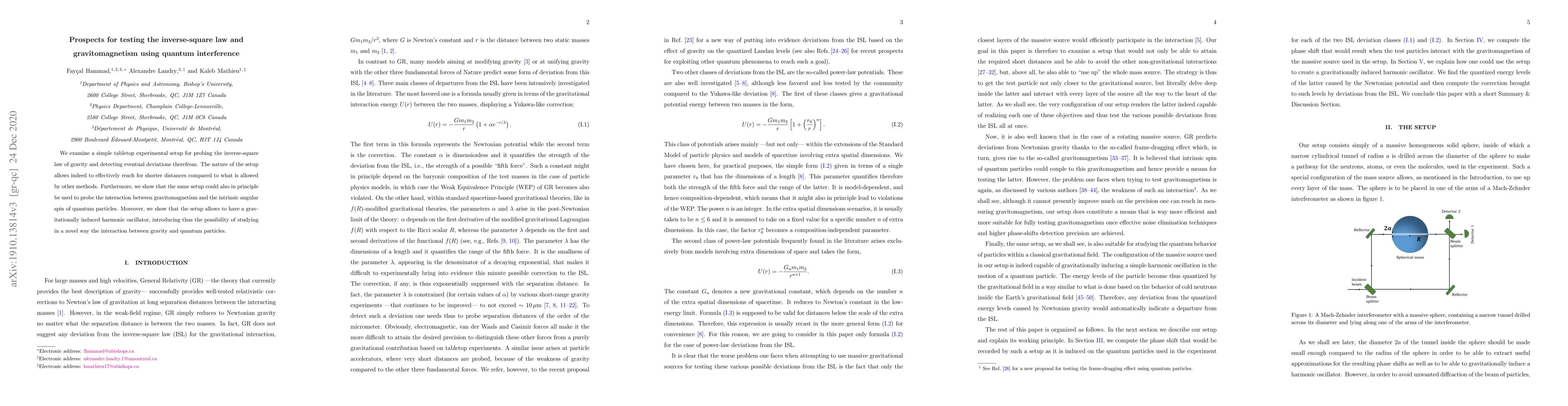 The paper proposes a tabletop experiment to test the inverse-square law of gravity at shorter distances, potentially revealing deviations. It also suggests this setup could investigate gravitomagnetism's interaction with quantum particles' spin and introduces a gravitationally induced harmonic oscillator for novel gravity-quantum particle interaction studies.