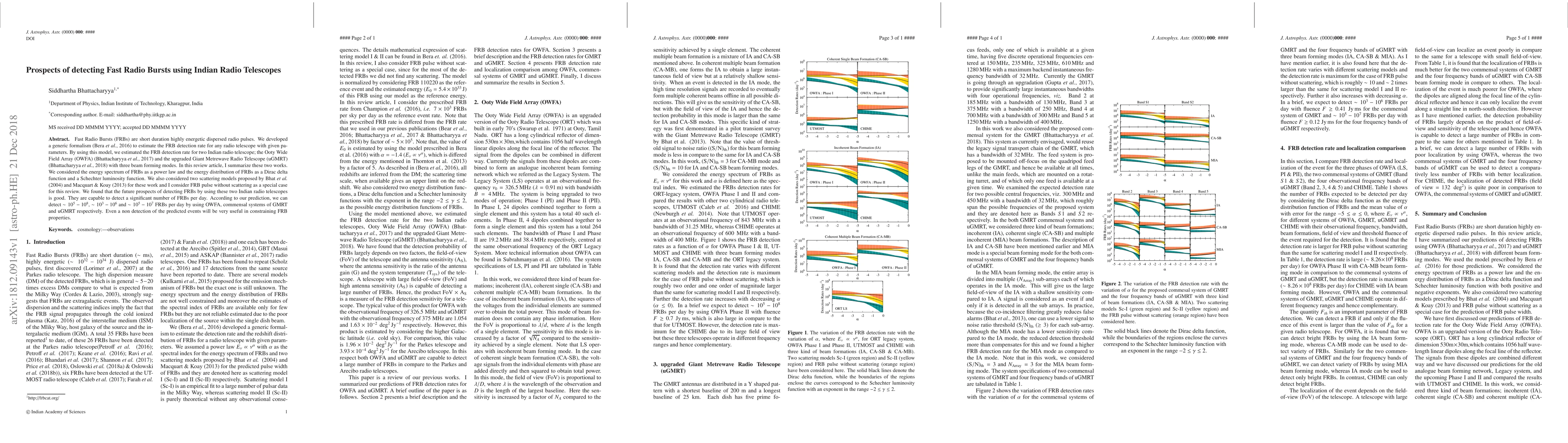 Fast Radio Bursts (FRBs) are short duration highly energetic dispersed radio pulses. We developed a generic formalism (Bera {\em et al.}, 2016) to estimate the FRB detection rate for any radio telescope with given parameters. By using this model, we estimated the FRB detection rate for two Indian radio telescope; the Ooty Wide Field Array (OWFA) (Bhattacharyya {\em et al.}, 2017) and the upgraded Giant Metrewave Radio Telescope (uGMRT) (Bhattacharyya {\em et al.}, 2018) with three beam forming modes. In this review article, I summarize these two works. We considered the energy spectrum of FRBs as a power law and the energy distribution of FRBs as a Dirac delta function and a Schechter luminosity function. We also considered two scattering models proposed by Bhat {\em et al.} (2004) and Macquart \& Koay (2013) for these work and I consider FRB pulse without scattering as a special case for this review. We found that the future prospects of detecting FRBs by using these two Indian radio telescopes is good. They are capable to detect a significant number of FRBs per day. According to our prediction, we can detect $\sim 10^5-10^8$, $\sim 10^3-10^6$ and $\sim 10^5-10^7$ FRBs per day by using OWFA, commensal systems of GMRT and uGMRT respectively. Even a non detection of the predicted events will be very useful in constraining FRB properties.