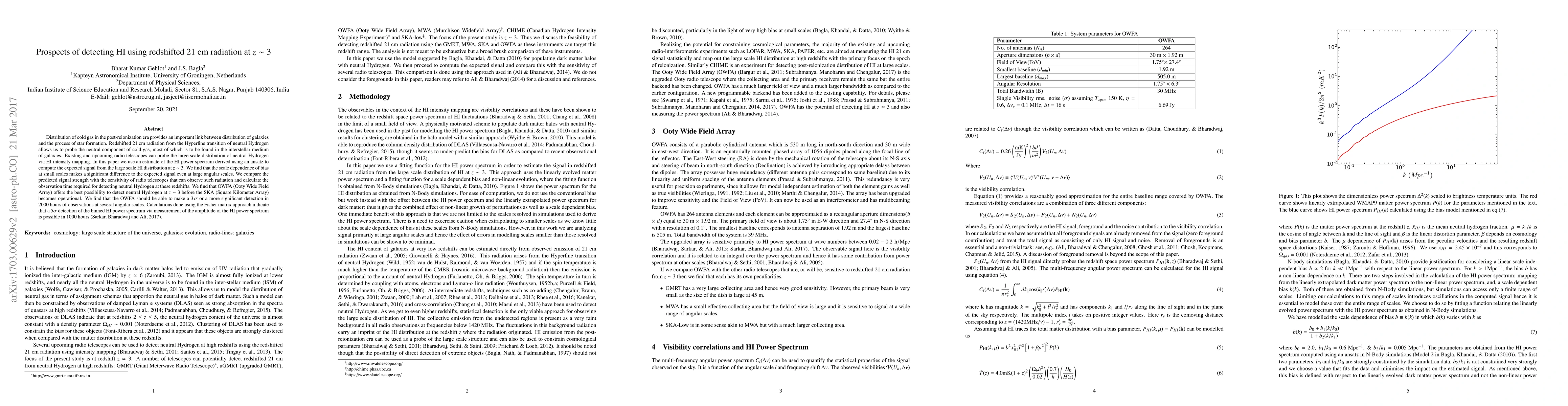 Distribution of cold gas in the post-reionization era provides an important link between distribution of galaxies and the process of star formation. Redshifted 21 cm radiation from the Hyperfine transition of neutral Hydrogen allows us to probe the neutral component of cold gas, most of which is to be found in the interstellar medium of galaxies. Existing and upcoming radio telescopes can probe the large scale distribution of neutral Hydrogen via HI intensity mapping. In this paper we use an estimate of the HI power spectrum derived using an ansatz to compute the expected signal from the large scale HI distribution at z ~ 3. We find that the scale dependence of bias at small scales makes a significant difference to the expected signal even at large angular scales. We compare the predicted signal strength with the sensitivity of radio telescopes that can observe such radiation and calculate the observation time required for detecting neutral Hydrogen at these redshifts. We find that OWFA (Ooty Wide Field Array) offers the best possibility to detect neutral Hydrogen at z ~ 3 before the SKA (Square Kilometer Array) becomes operational. We find that the OWFA should be able to make a 3 sigma or a more significant detection in 2000 hours of observations at several angular scales. Calculations done using the Fisher matrix approach indicate that a 5 sigma detection of the binned HI power spectrum via measurement of the amplitude of the HI power spectrum is possible in 1000 hours (Sarkar, Bharadwaj and Ali, 2017).