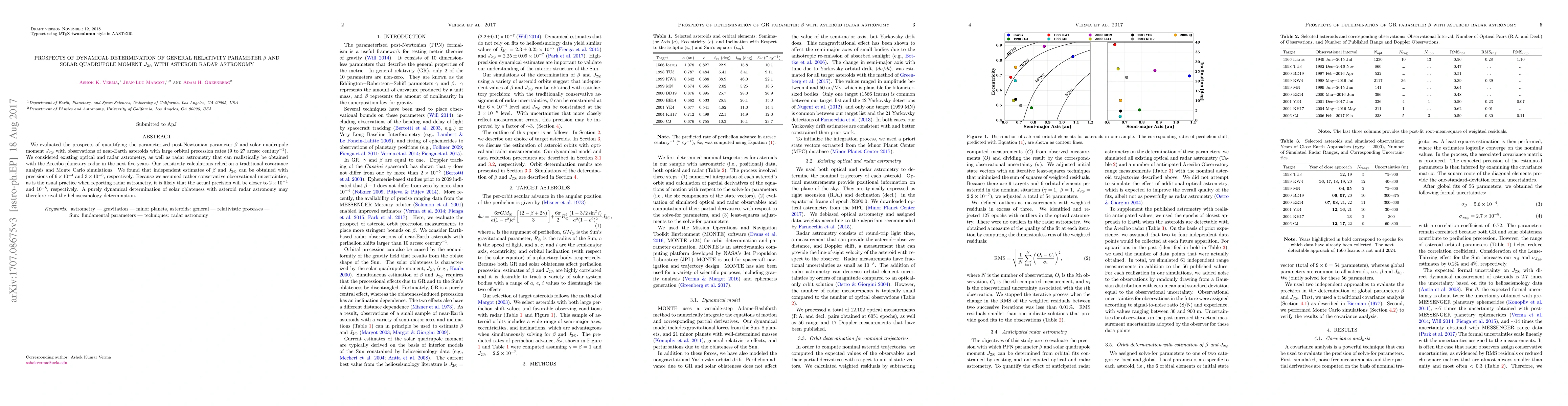 We evaluated the prospects of quantifying the parameterized post-Newtonian parameter beta and solar quadrupole moment J2 with observations of near-Earth asteroids with large orbital precession rates (9 to 27 arcsec century$^{-1}$). We considered existing optical and radar astrometry, as well as radar astrometry that can realistically be obtained with the Arecibo planetary radar in the next five years. Our sensitivity calculations relied on a traditional covariance analysis and Monte Carlo simulations. We found that independent estimates of beta and J2 can be obtained with precisions of $6\times10^{-4}$ and $3\times10^{-8}$, respectively. Because we assumed rather conservative observational uncertainties, as is the usual practice when reporting radar astrometry, it is likely that the actual precision will be closer to $2\times10^{-4}$ and $10^{-8}$, respectively. A purely dynamical determination of solar oblateness with asteroid radar astronomy may therefore rival the helioseismology determination.